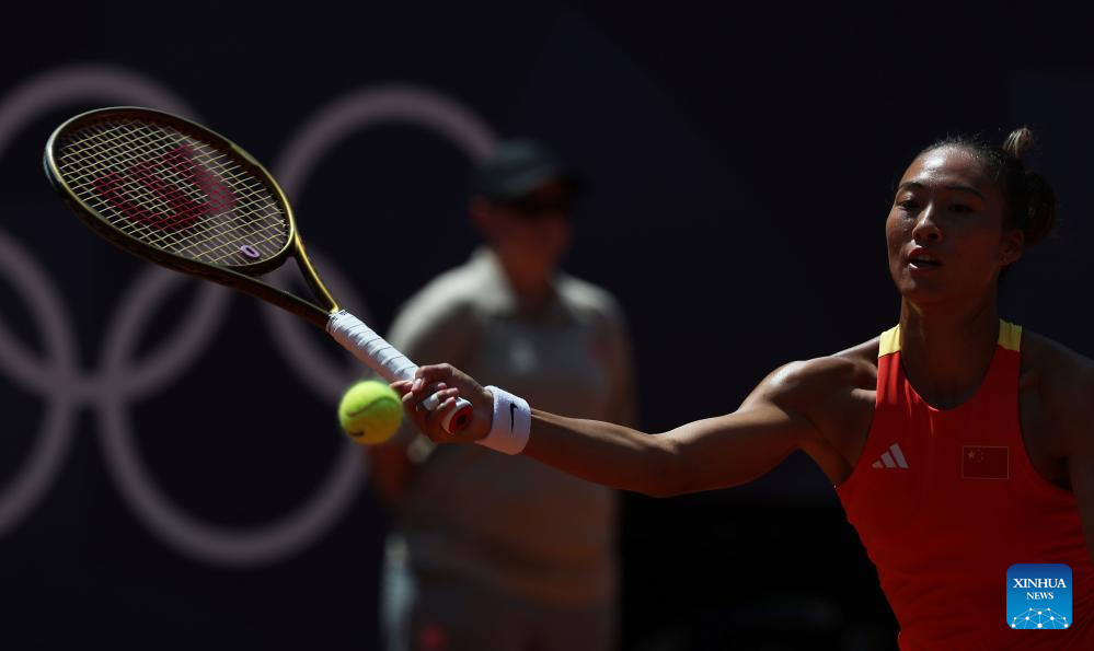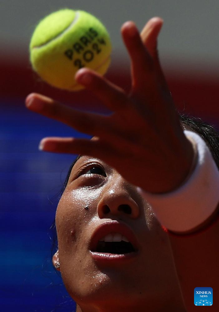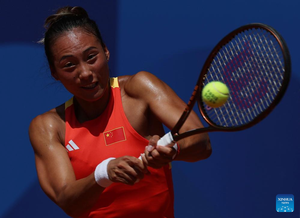 Zheng Qinwen of China competes during the women's singles quarter-final match of tennis between Zheng Qinwen of China and Angelique Kerber of Germany at the Paris 2024 Olympic Games in Paris, France, on July 31, 2024. (Xinhua/Gao Jing)