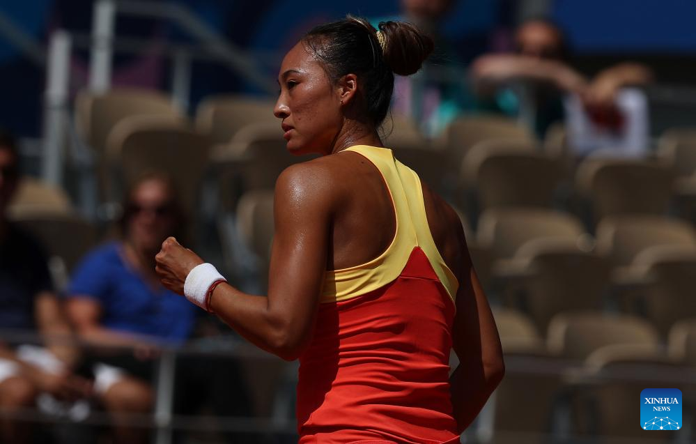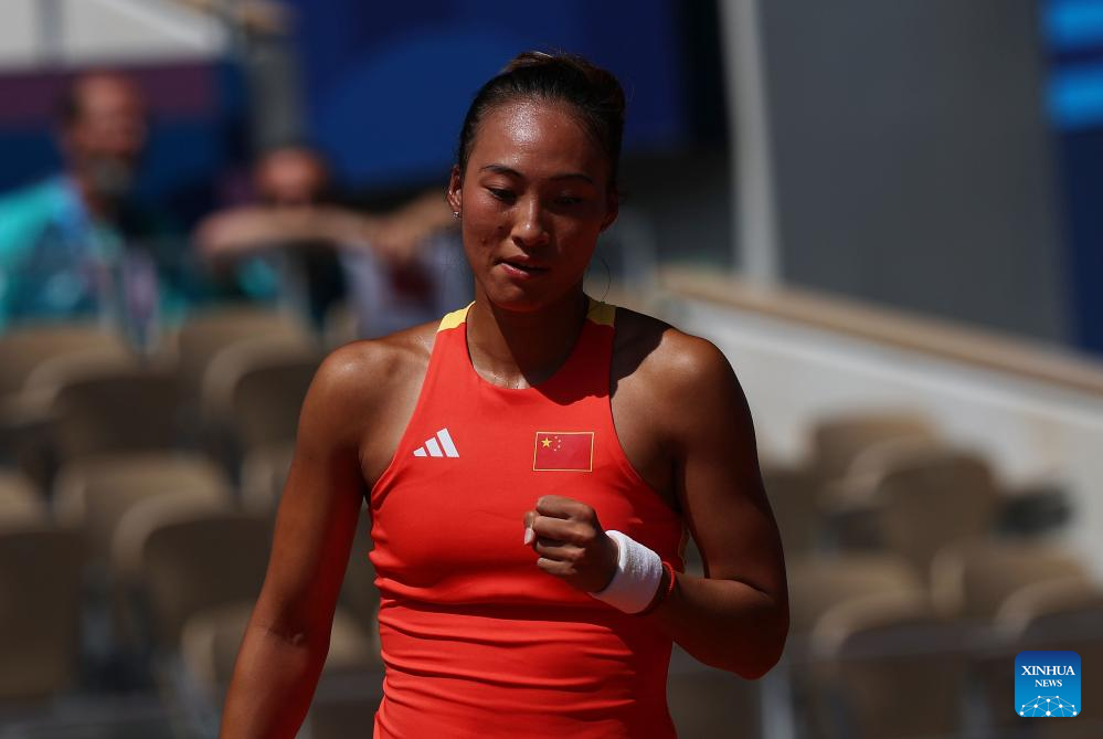 Zheng Qinwen of China reacts during the women's singles quarter-final match of tennis between Zheng Qinwen of China and Angelique Kerber of Germany at the Paris 2024 Olympic Games in Paris, France, on July 31, 2024. (Xinhua/Gao Jing)