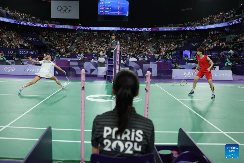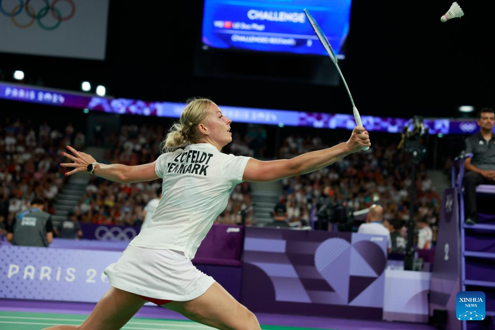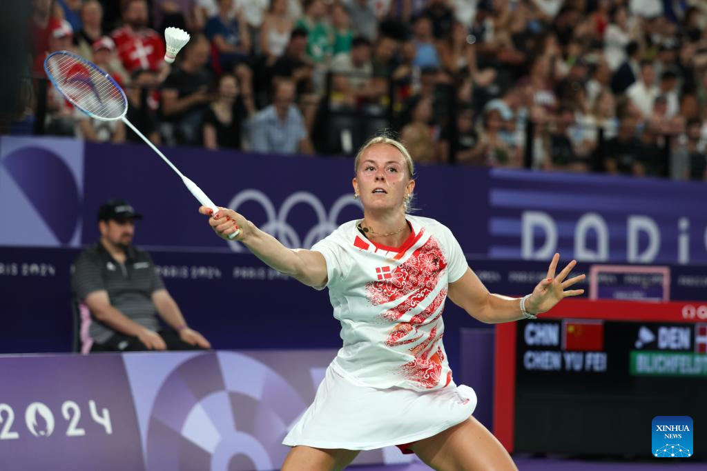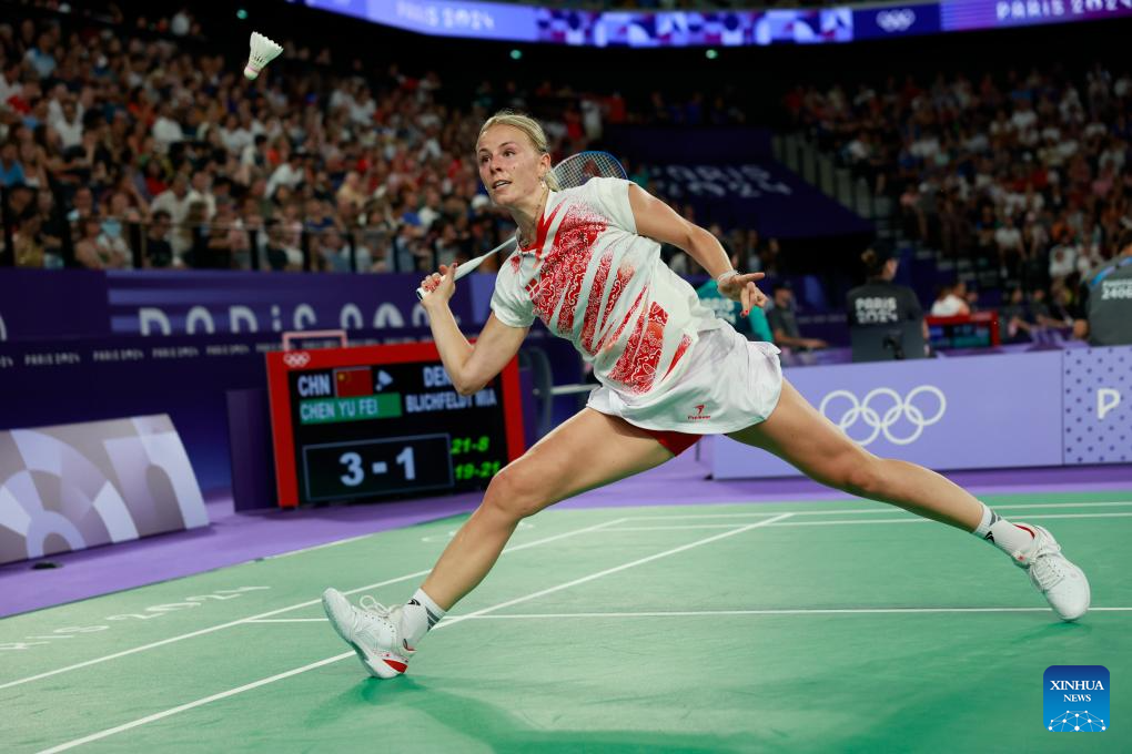 Mia Blichfeldt of Denmark competes during the badminton women's singles group play stage match against Chen Yufei of China at Paris 2024 Olympic Games in Paris, France, July 31, 2024. (Xinhua/Ren Zhenglai)