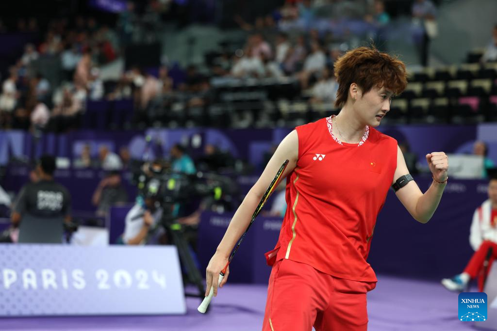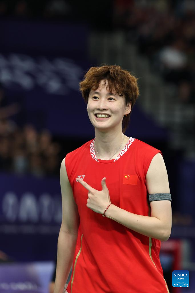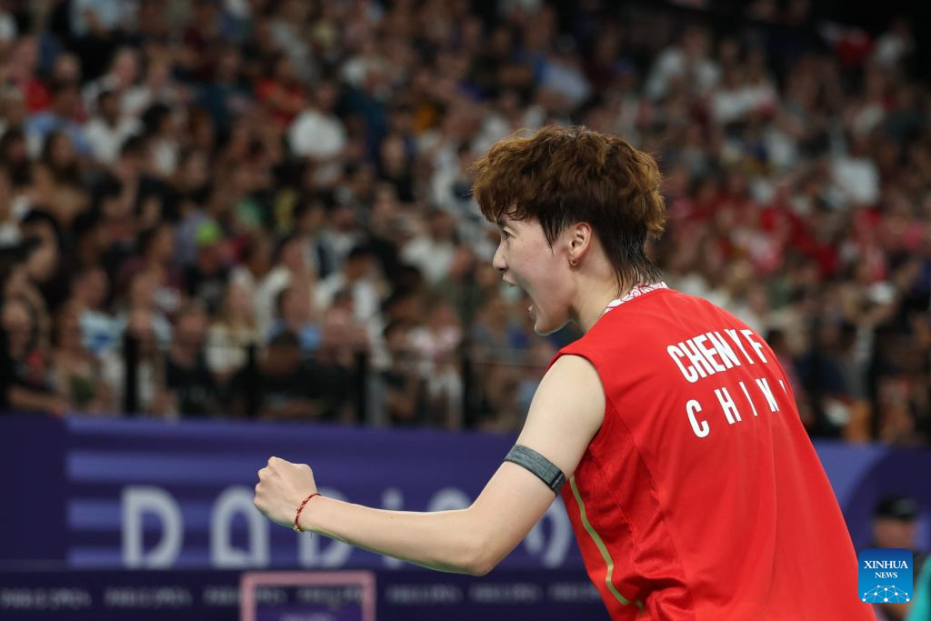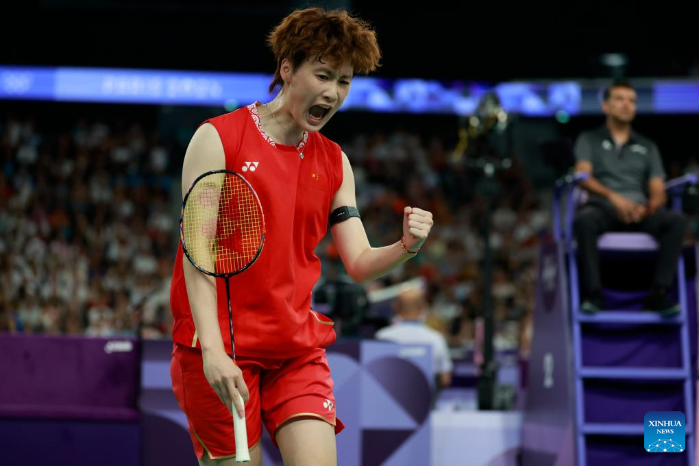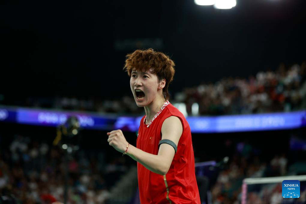 Chen Yufei of China celebrates after the badminton women's singles group play stage match against Mia Blichfeldt at Paris 2024 Olympic Games in Paris, France, July 31, 2024. (Xinhua/Chen Bin)
