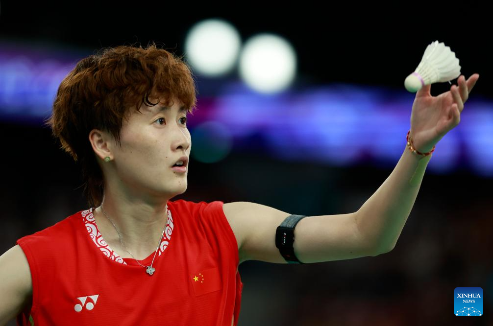 Chen Yufei of China competes during the badminton women's singles group play stage match against Mia Blichfeldt of Denmark at Paris 2024 Olympic Games in Paris, France, July 31, 2024. (Xinhua/Ren Zhenglai)