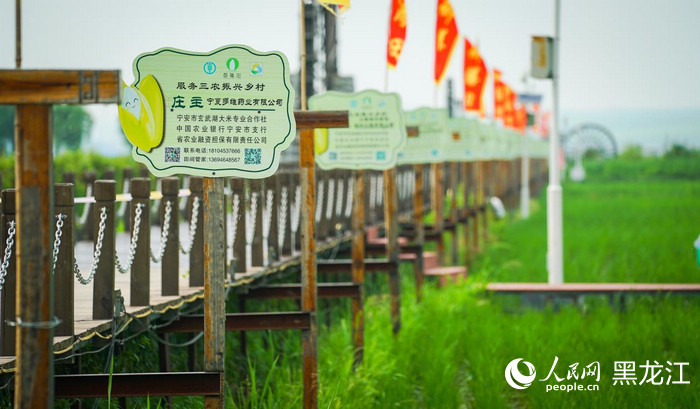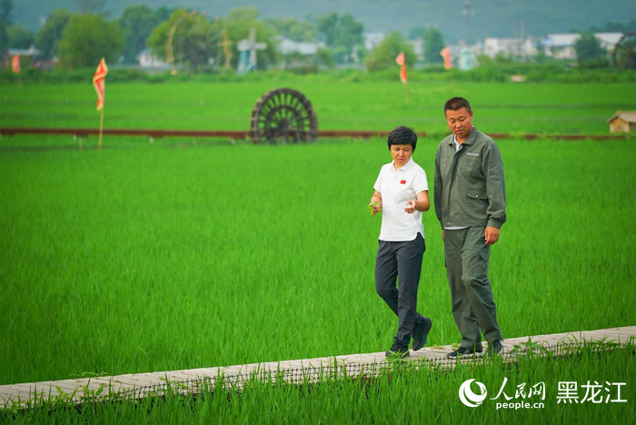 Chen Yujia (left) and a villager check on the growth of rice in the fields in Shangguandi village, Bohai township, Ning’an, a county-level city administered by Mudanjiang city, northeast China’s Heilongjiang Province. (People's Daily Online/Su Jinggang)