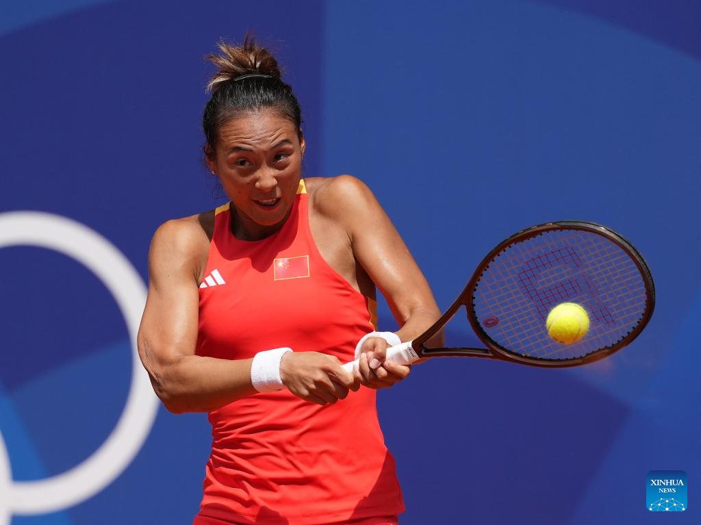 Zheng Qinwen of China competes during the women's singles semi-final match of tennis between Zheng Qinwen of China and Iga Swiatek of Poland at the Paris 2024 Olympic Games in Paris, France, on Aug. 1, 2024. (Xinhua/Wan Xiang)