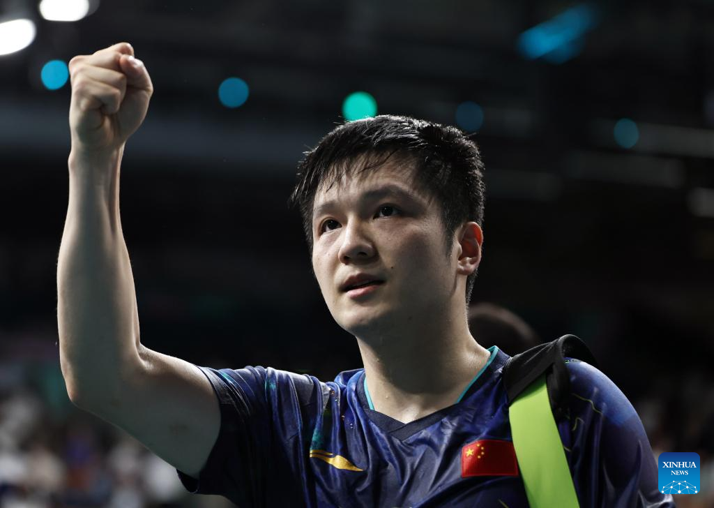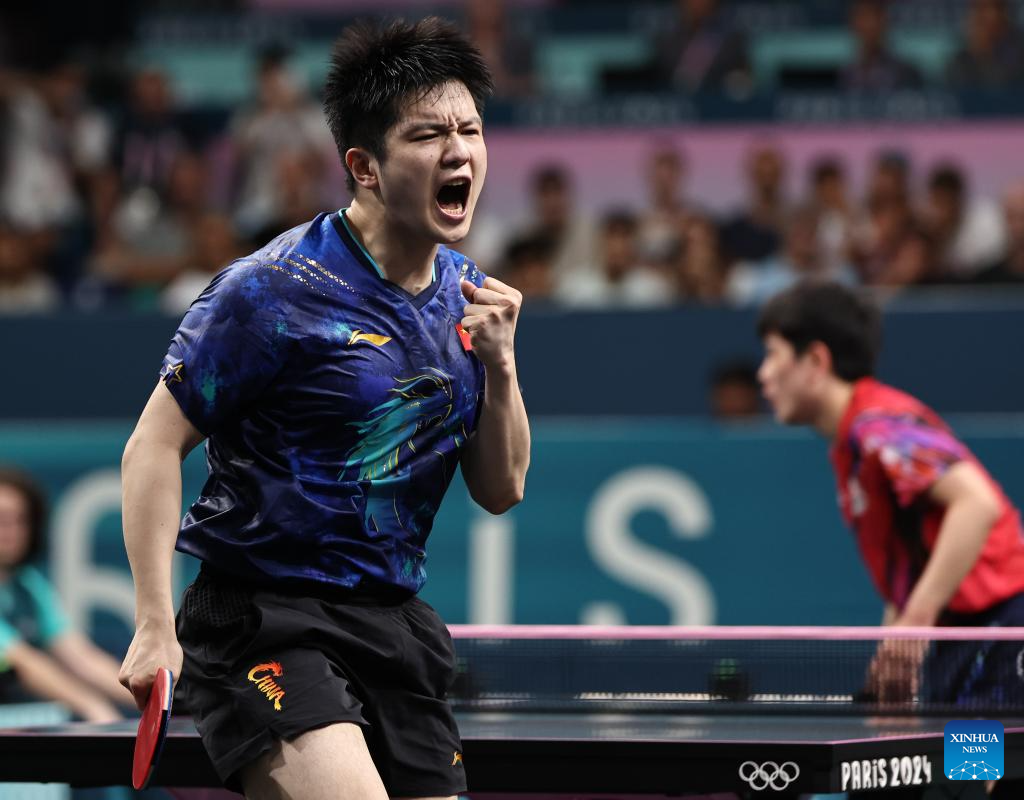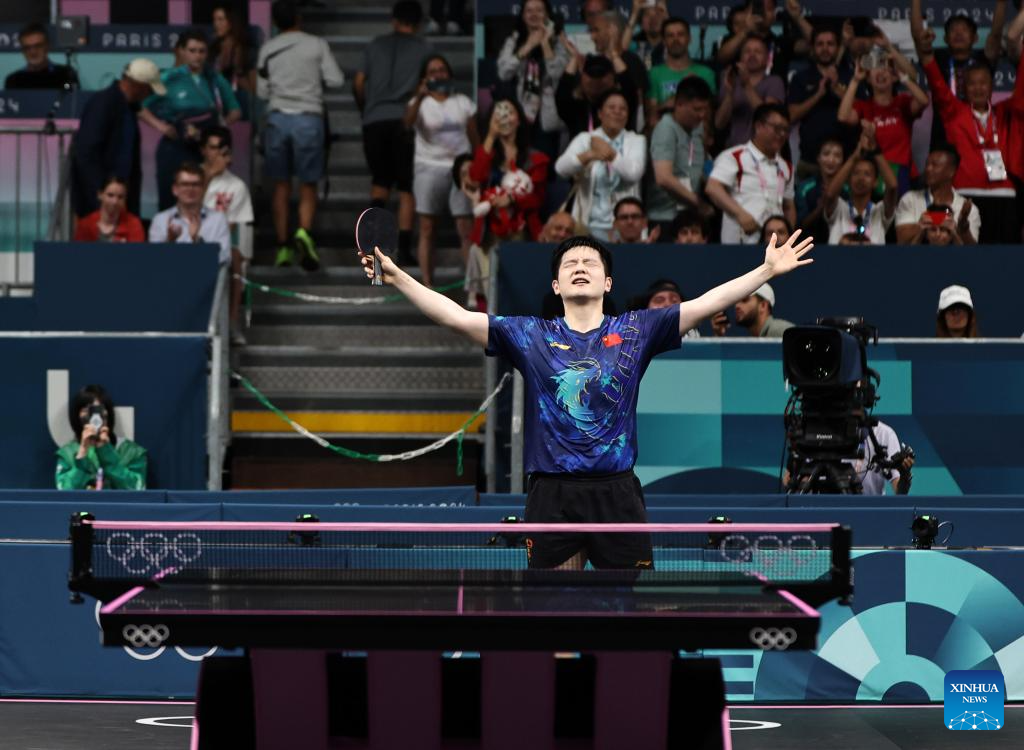Fan Zhendong of China celebrates after the table tennis men's singles quarterfinal against Harimoto Tomokazu of Japan at Paris 2024 Olympic Games in Paris, France, Aug. 1, 2024. (Xinhua/Xu Zijian)