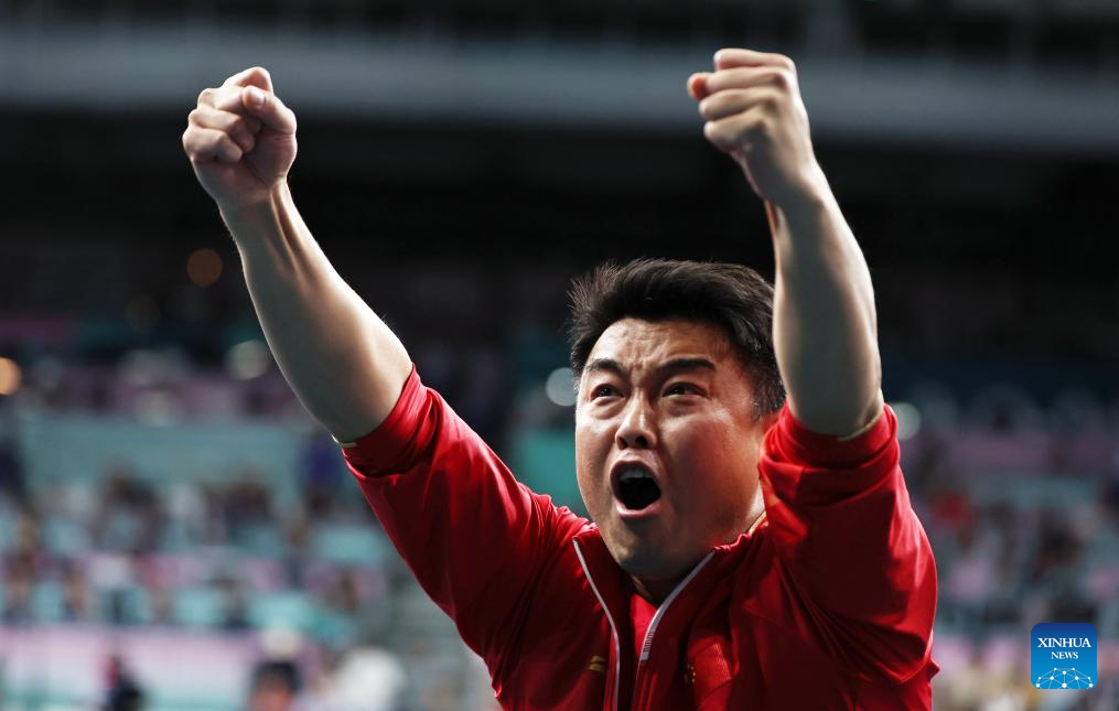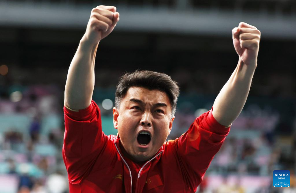 Coach Wang Hao of China celebrates after the table tennis men's singles quarterfinal at Paris 2024 Olympic Games in Paris, France, Aug. 1, 2024. (Xinhua/Wang Dongzhen)