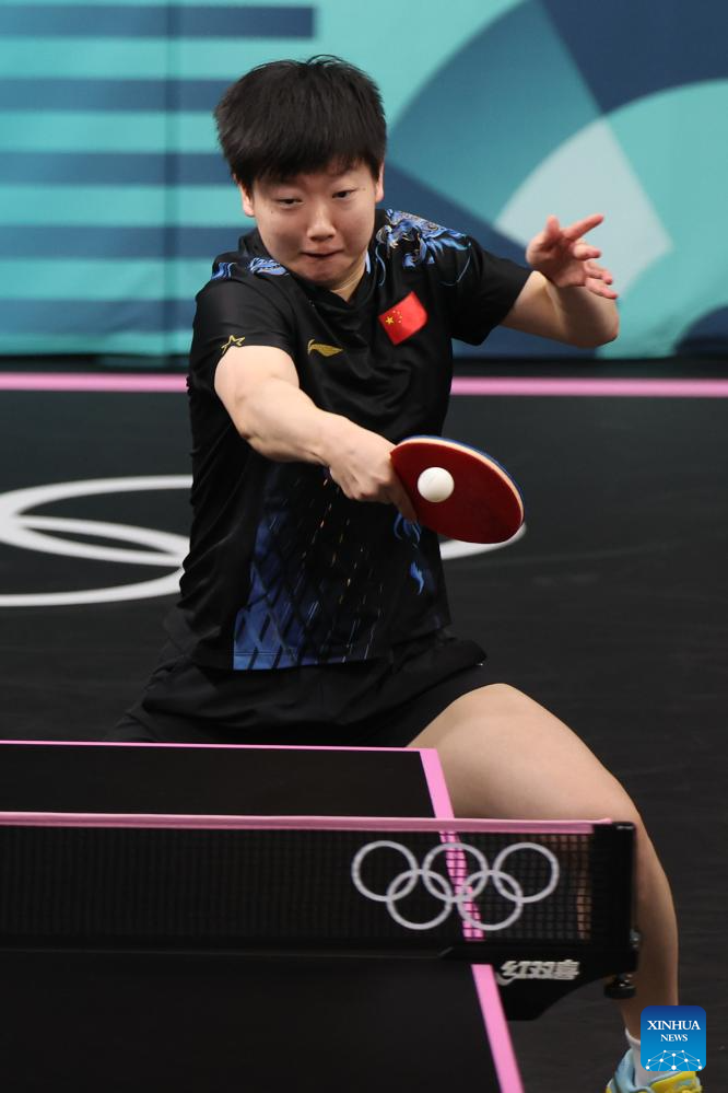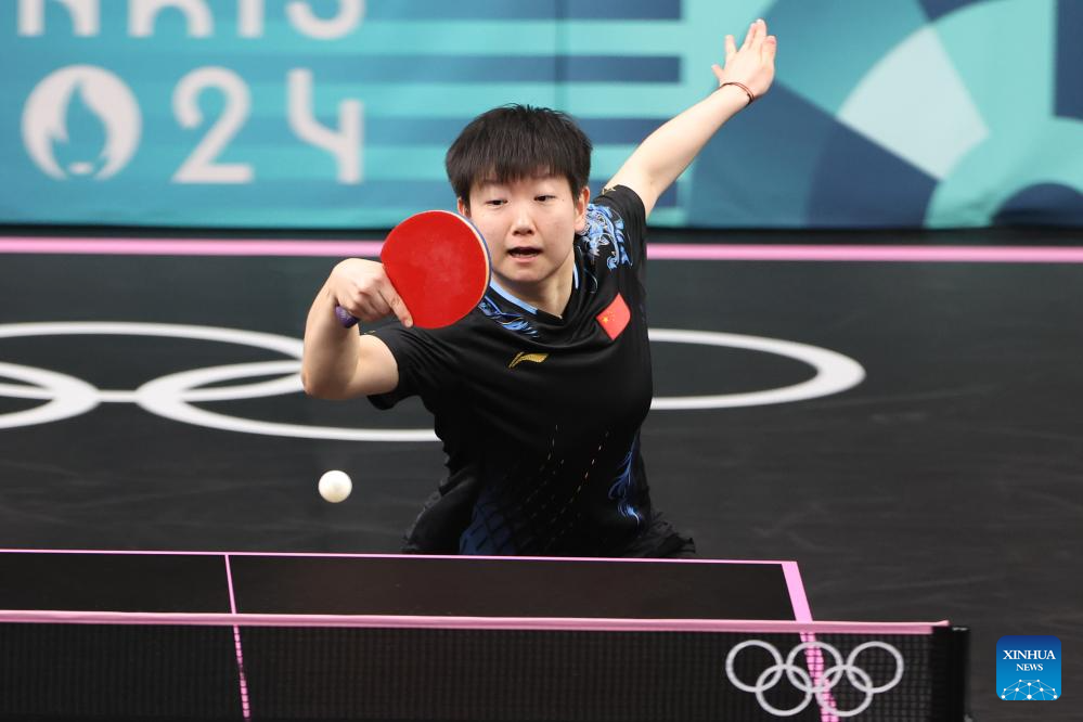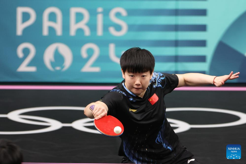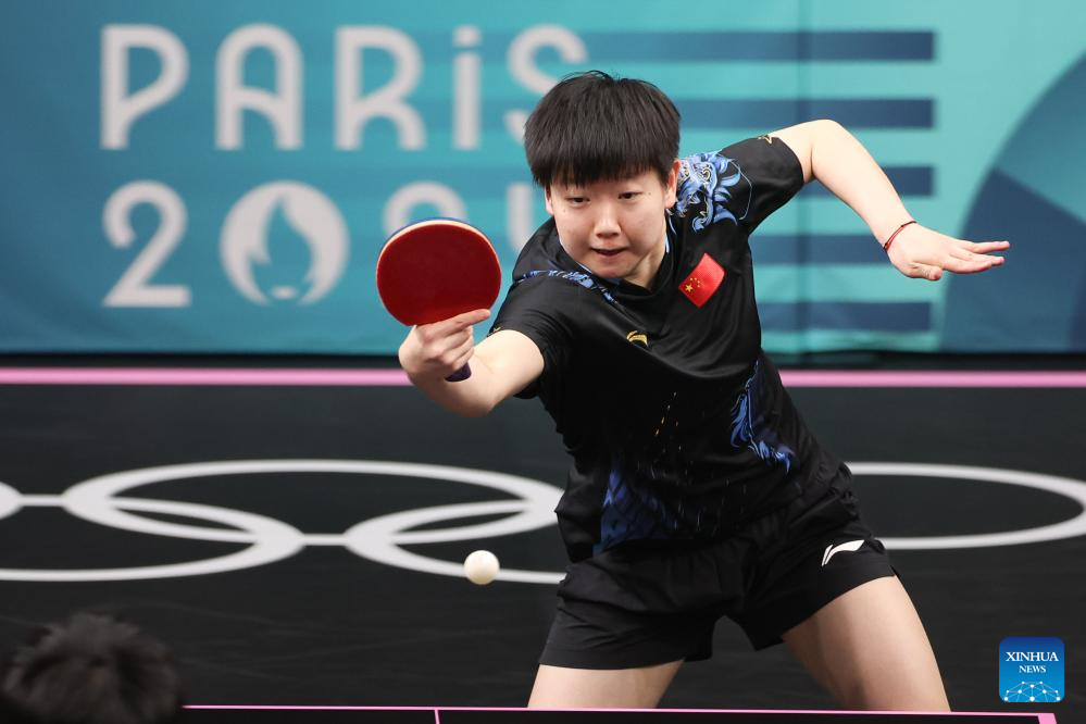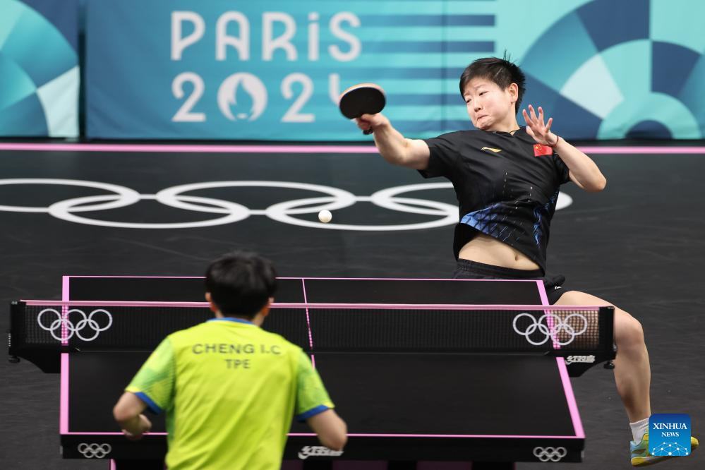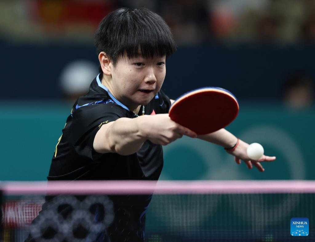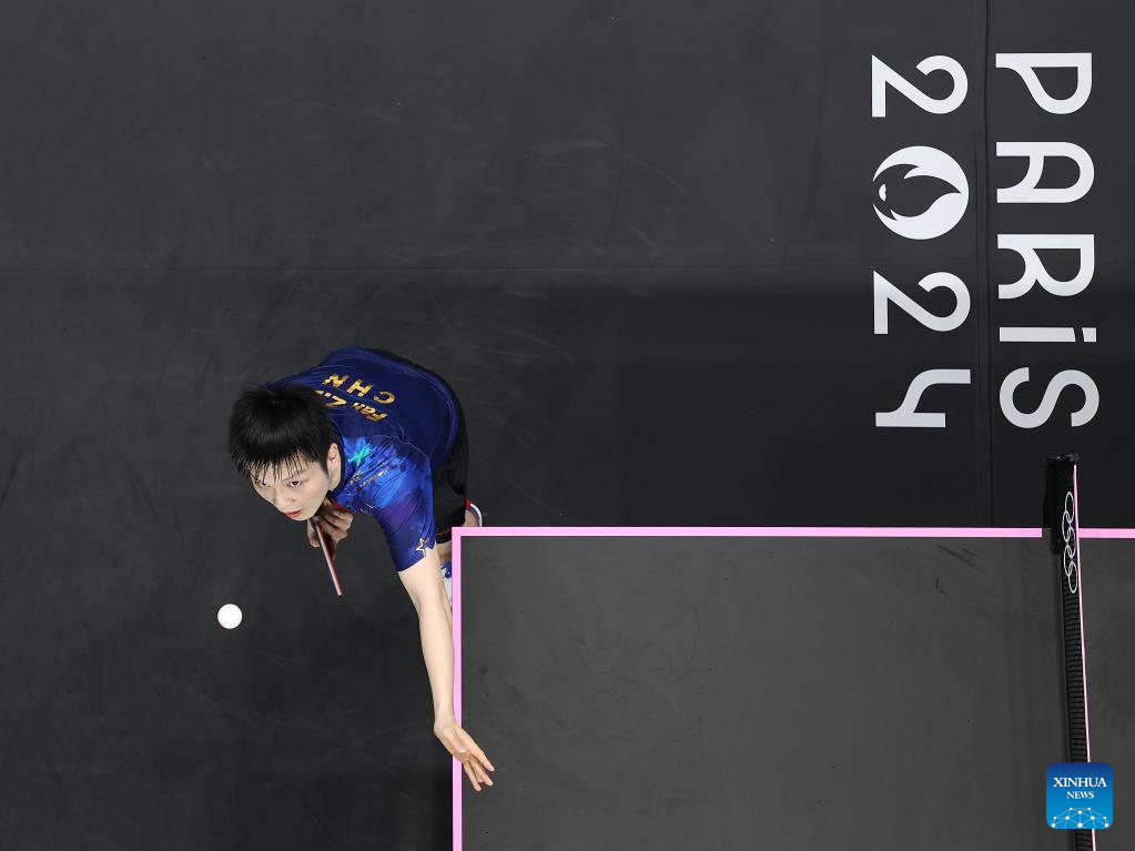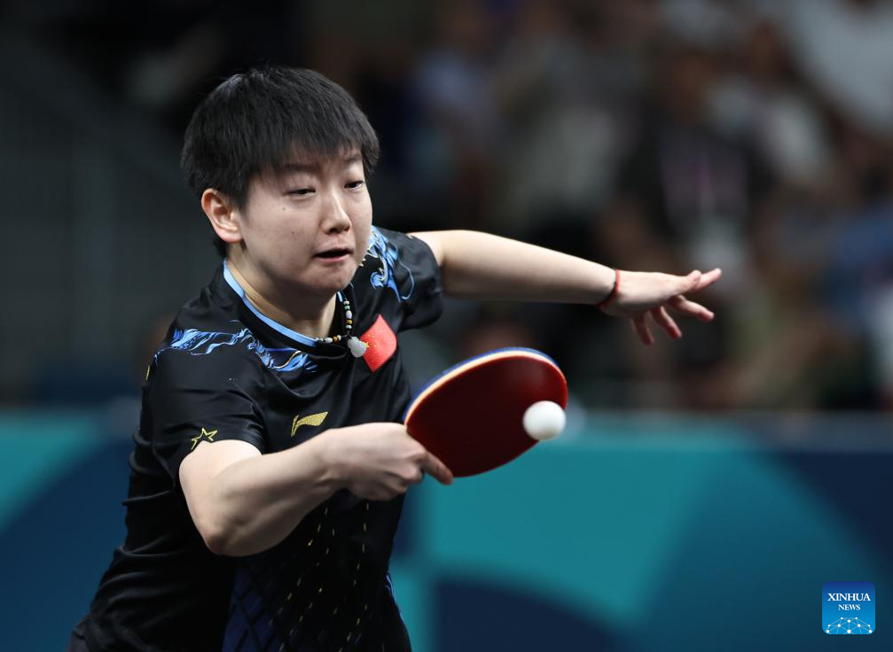 Sun Yingsha of China competes during the women's singles quaterfinal match of table tennis between Sun Yingsha of China and Cheng I-Ching of Chinese Taipei at the Paris 2024 Olympic Games in Paris, France, on Aug. 1, 2024. (Xinhua/Liu Xu)