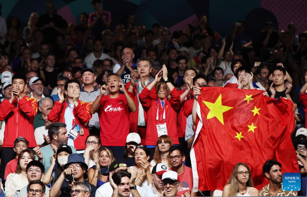 Fan Zhendong of China greets spectators after the table tennis men's singles quarterfinal against Harimoto Tomokazu of Japan at Paris 2024 Olympic Games in Paris, France, Aug. 1, 2024. (Xinhua/Wang Dongzhen)