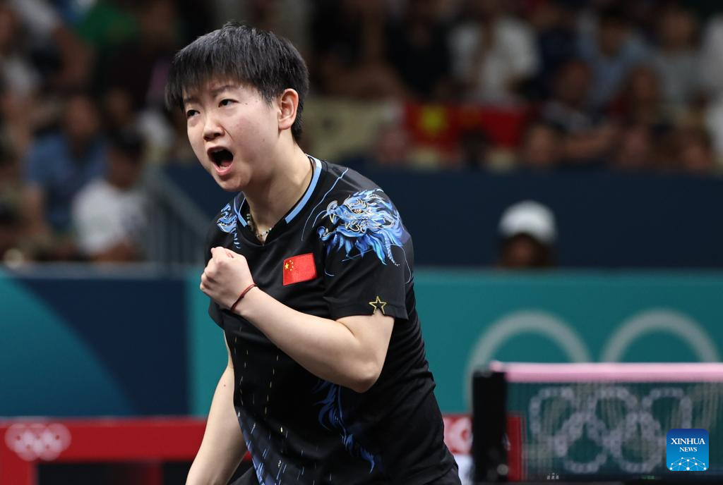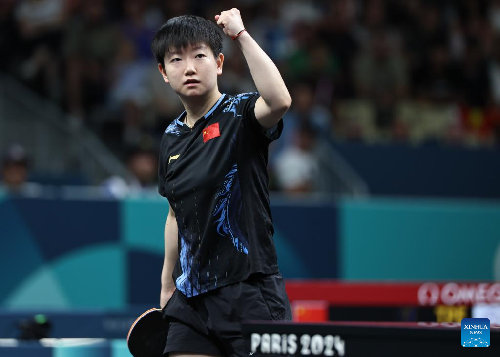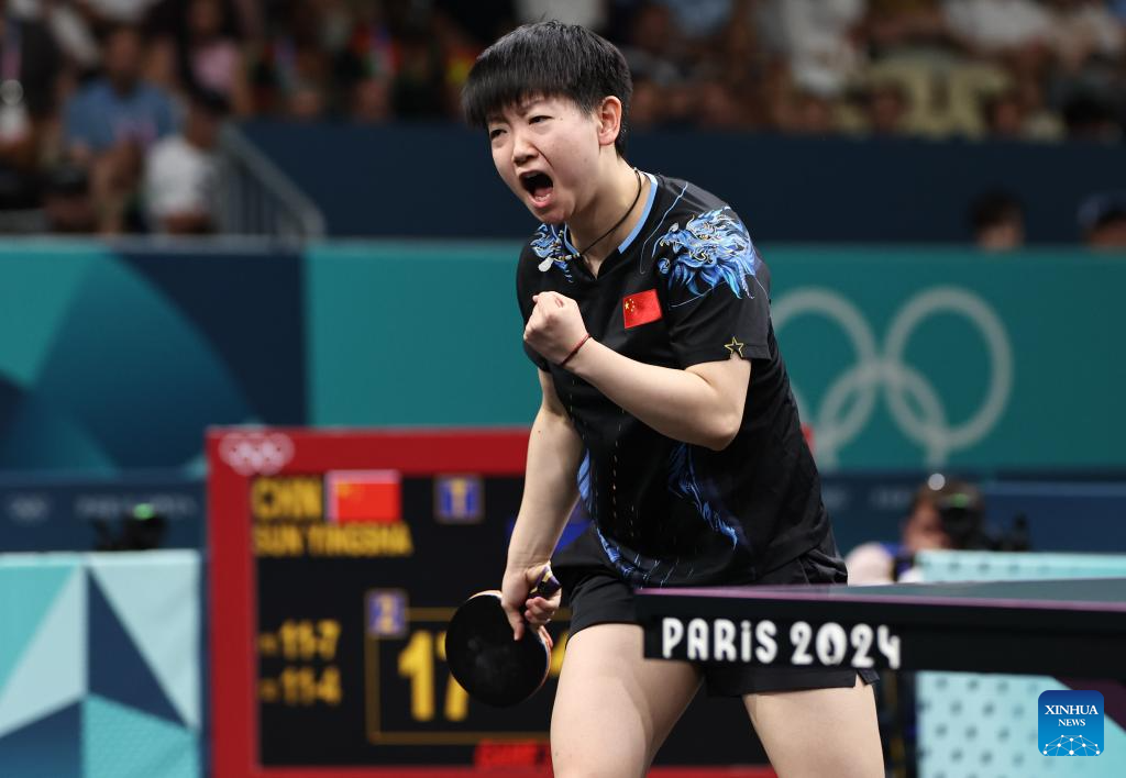 Sun Yingsha of China celebrates during the women's singles quarterfinal match of table tennis between Sun Yingsha of China and Cheng I-Ching of Chinese Taipei at the Paris 2024 Olympic Games in Paris, France, on Aug. 1, 2024. (Xinhua/Wang Dongzhen)