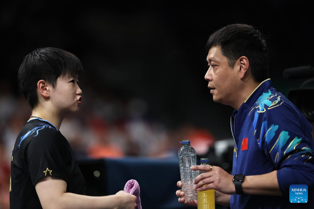 Coach Qiu Yike (R) talks with Sun Yingsha of China during the women's singles quarterfinal match of table tennis between Sun Yingsha of China and Cheng I-Ching of Chinese Taipei at the Paris 2024 Olympic Games in Paris, France, on Aug. 1, 2024. (Xinhua/Wang Dongzhen)