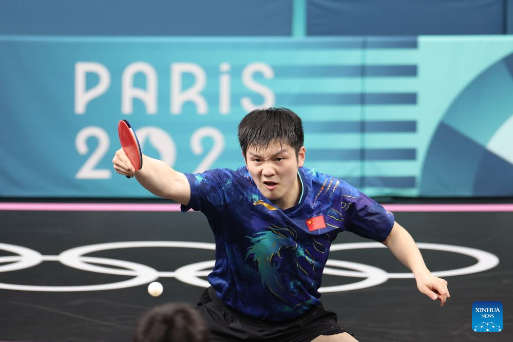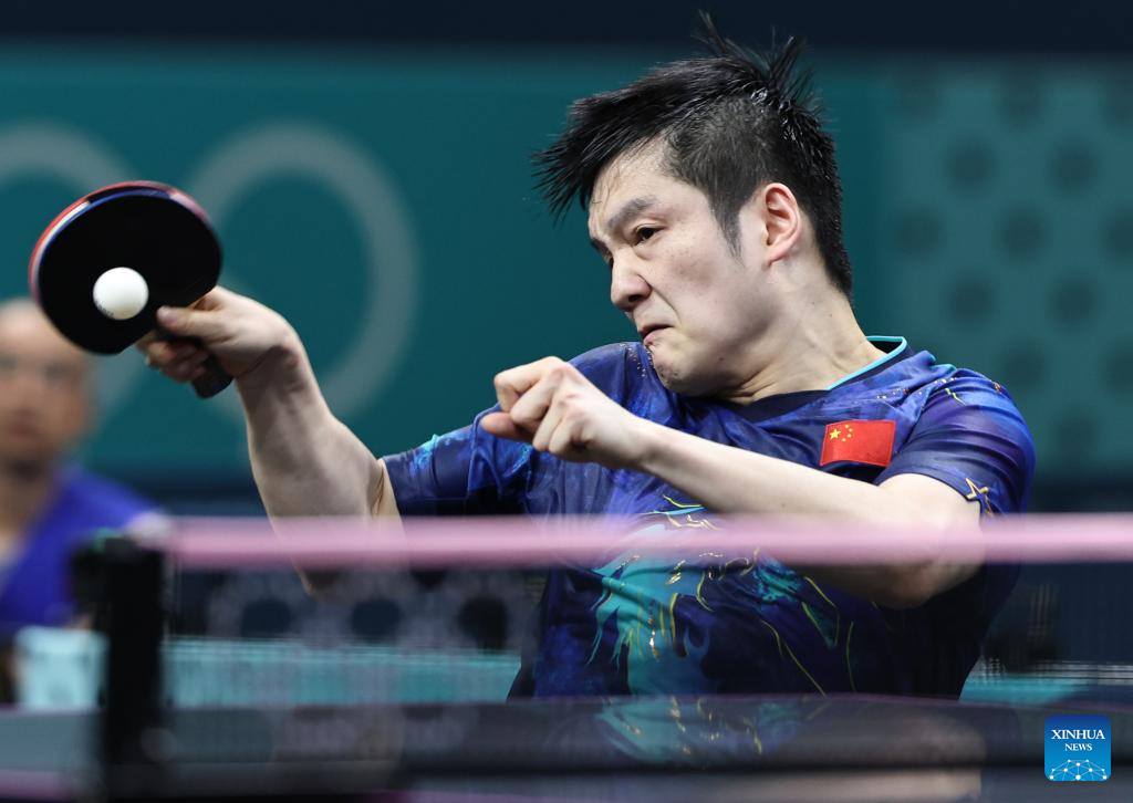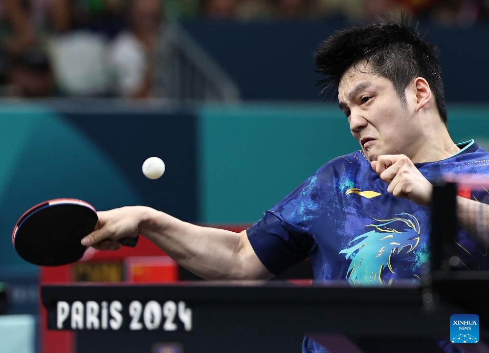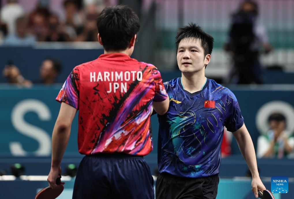 PARIS, Aug. 1 (Xinhua) -- China's Fan Zhendong endured a tough contest in the Olympic table tennis men's singles quarterfinals here on Thursday, being beaten in the first two sets before managing a 4-3 comeback win over Tomokazu Harimoto of Japan in a seven-set thriller.