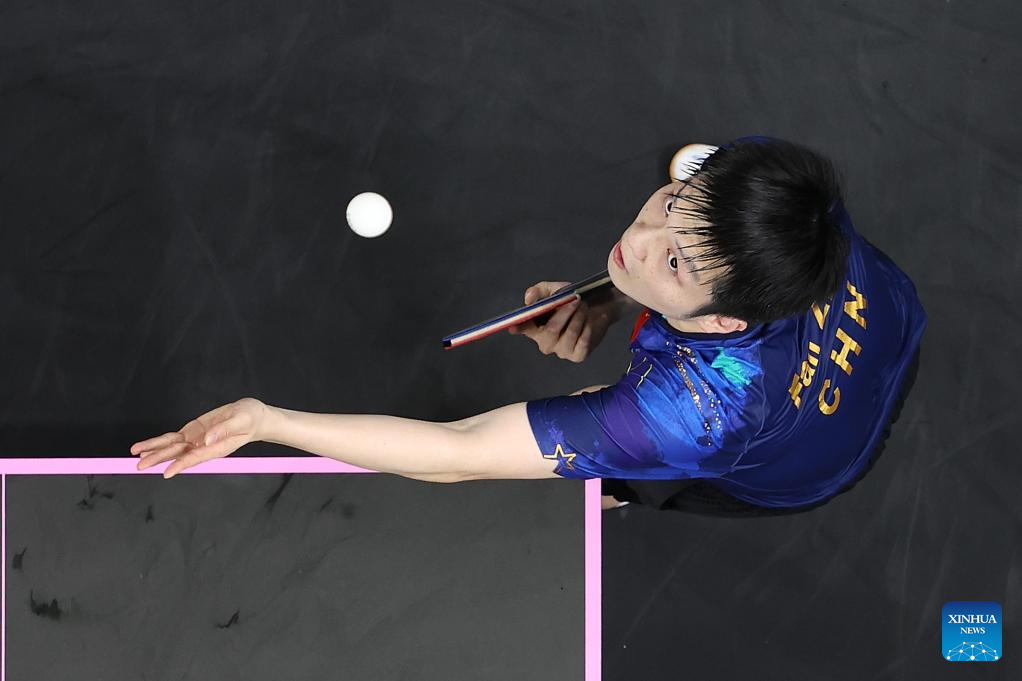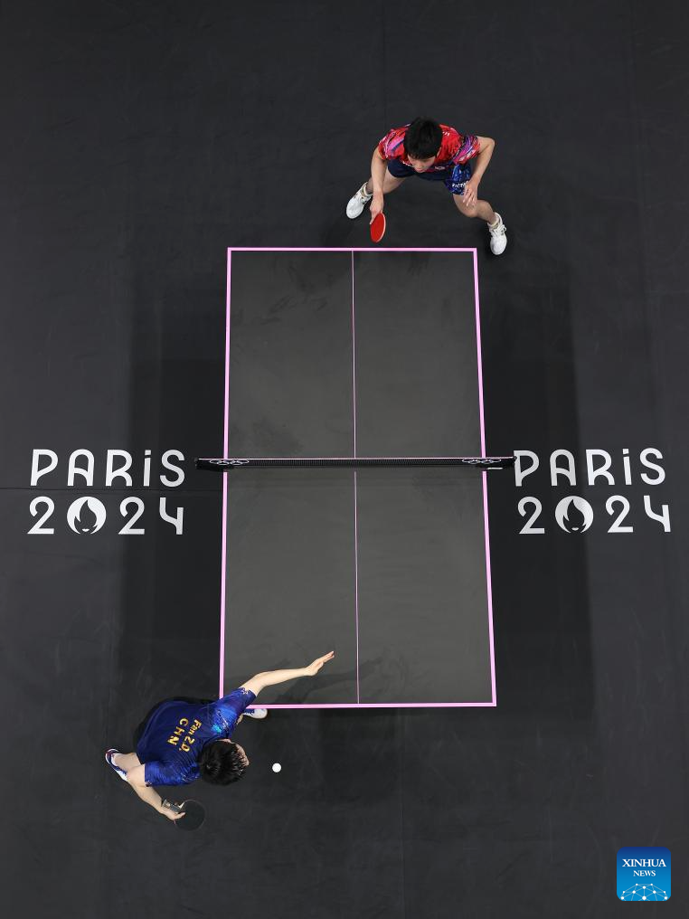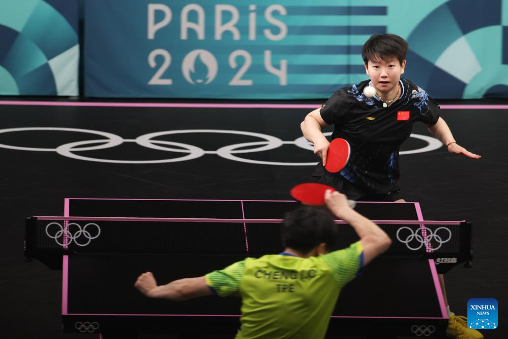 Sun Yingsha (top) of China competes during the women's singles quaterfinal match of table tennis between Sun Yingsha of China and Cheng I-Ching of Chinese Taipei at the Paris 2024 Olympic Games in Paris, France, on Aug. 1, 2024. (Xinhua/Liu Xu)