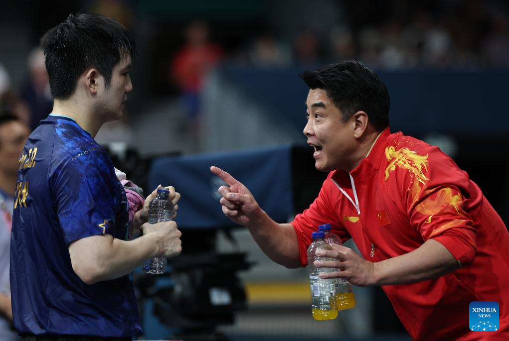 Coach Wang Hao instructs Fan Zhendong of China during the table tennis men's singles quarterfinal against Harimoto Tomokazu of Japan at Paris 2024 Olympic Games in Paris, France, Aug. 1, 2024. (Xinhua/Wang Dongzhen)