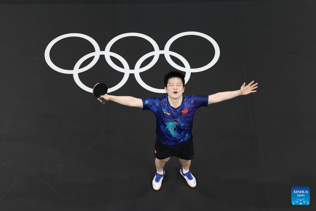 Fan Zhendong of China celebrates after the table tennis men's singles quarterfinal against Harimoto Tomokazu of Japan at Paris 2024 Olympic Games in Paris, France, Aug. 1, 2024. (Xinhua/Wang Dongzhen)