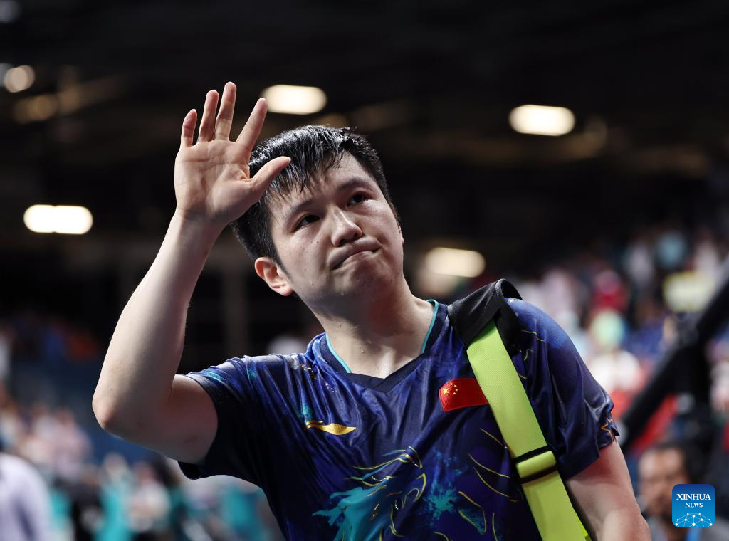 Fan Zhendong of China greets the spectators after the table tennis men's singles quarterfinal against Harimoto Tomokazu of Japan at Paris 2024 Olympic Games in Paris, France, Aug. 1, 2024. (Xinhua/Wang Dongzhen)