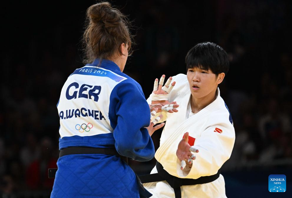 Ma Zhenzhao (white) of China competes against Anna-Maria Wagner of Germany at the judo women -78kg contest for bronze medal at the Paris 2024 Olympic Games in Paris, France, Aug. 1, 2024. (Xinhua/Wu Wei)