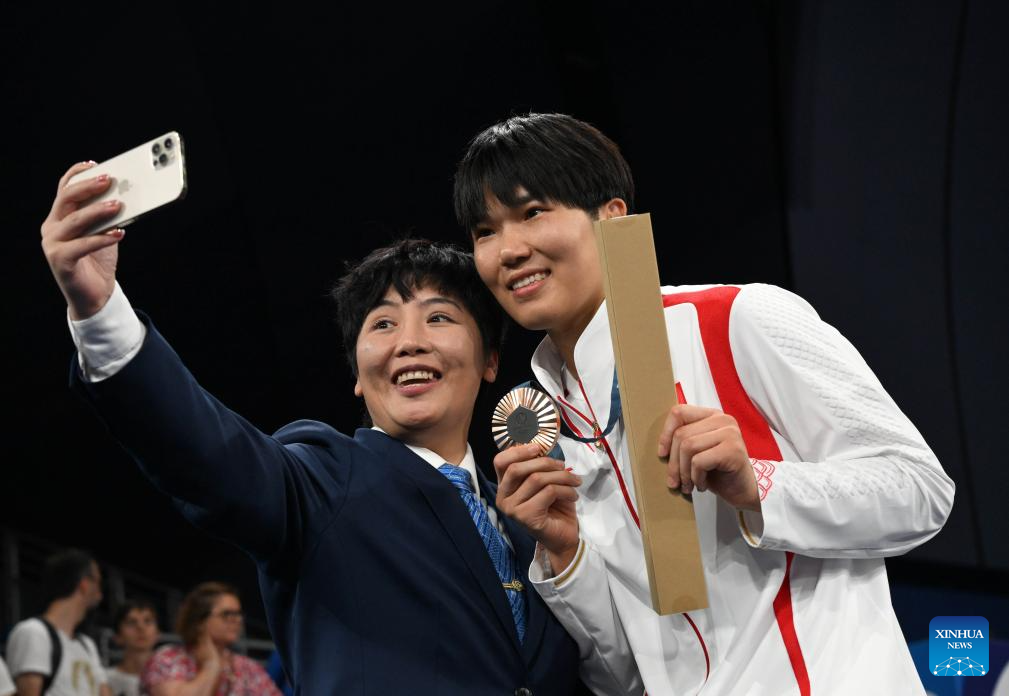 Ma Zhenzhao (white) of China takes selfies with referee Zhang Guangyue from China after defeating Anna-Maria Wagner of Germany at the judo women -78kg contest for bronze medal at the Paris 2024 Olympic Games in Paris, France, Aug. 1, 2024. (Xinhua/Li An)