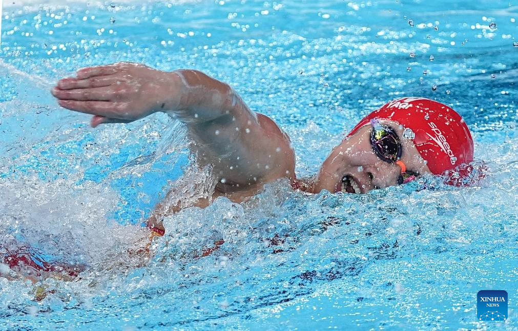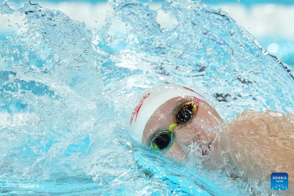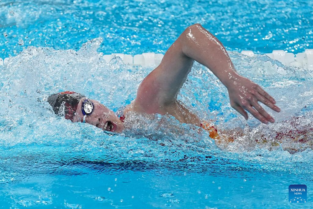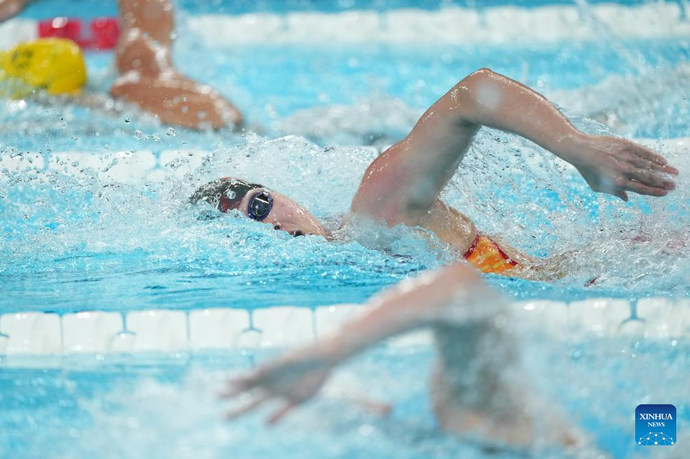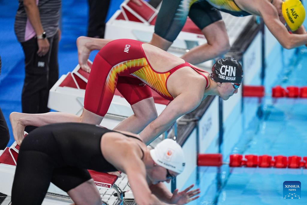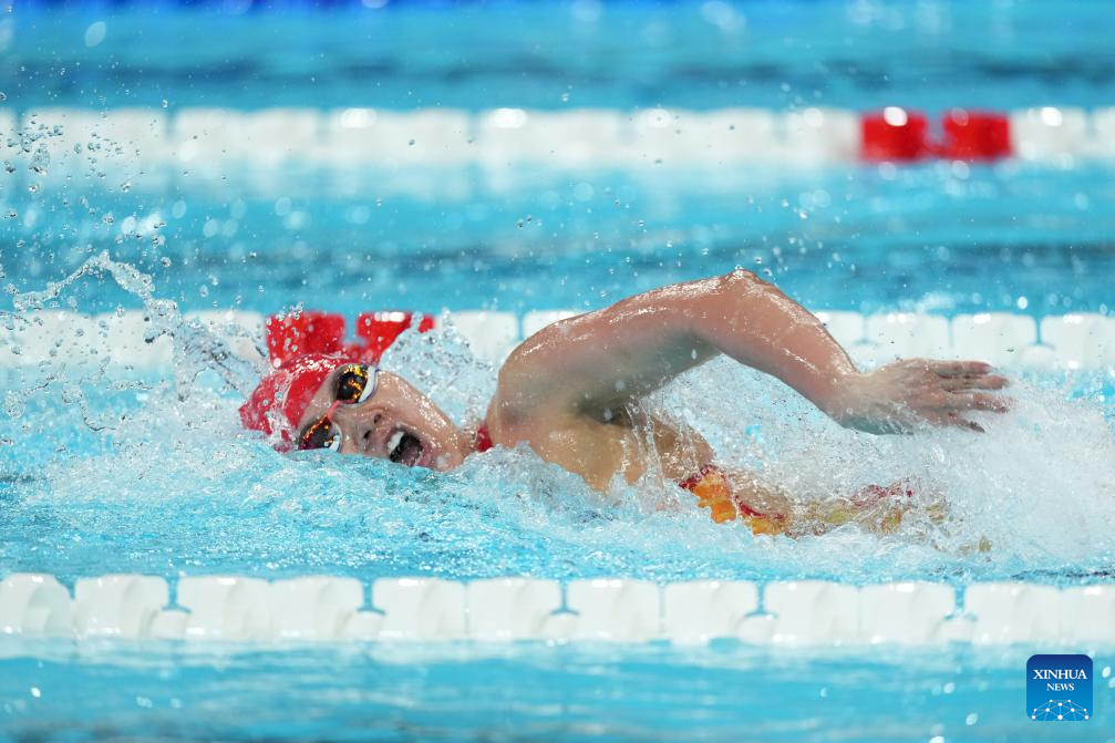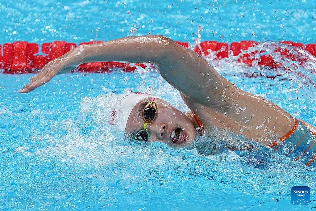 Tang Muhan of China competes during the women's 4×200m freestyle relay heats of swimming at the Paris 2024 Olympic Games in Paris, France, on Aug.1, 2024. (Xinhua/Du Yu)