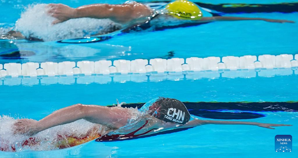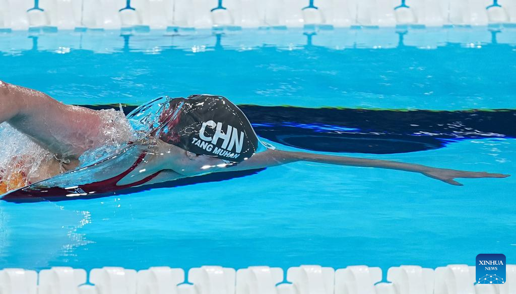 Tang Muhan of China competes during the women's 4×200m freestyle relay heats of swimming at the Paris 2024 Olympic Games in Paris, France, on Aug.1, 2024. (Xinhua/Xue Yuge)