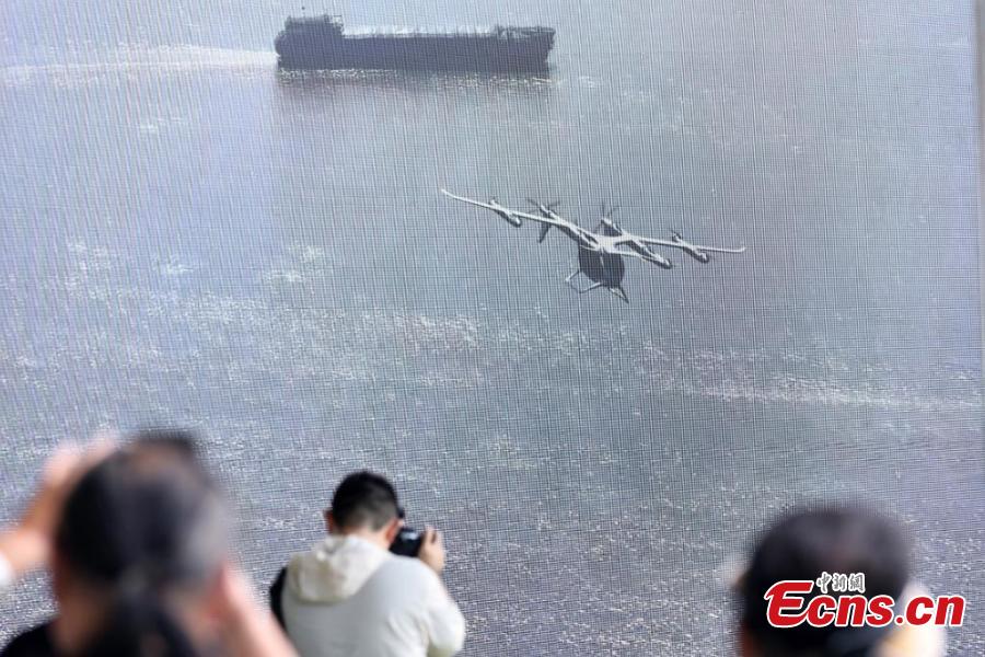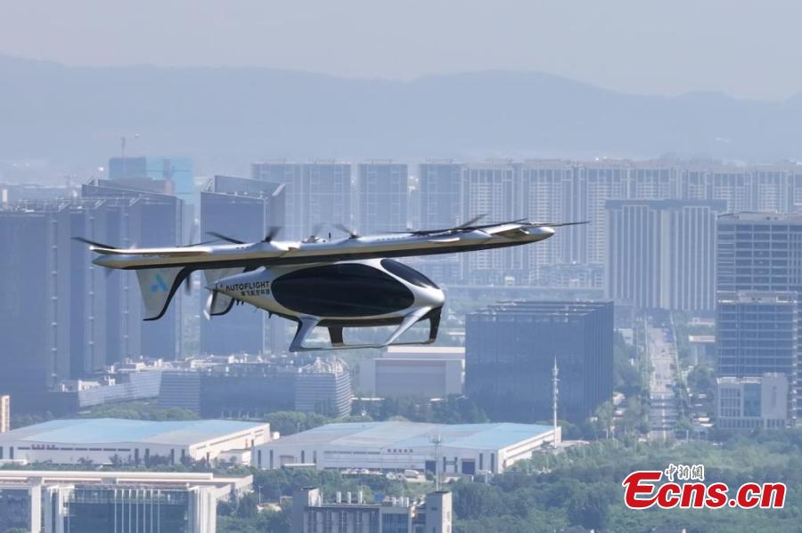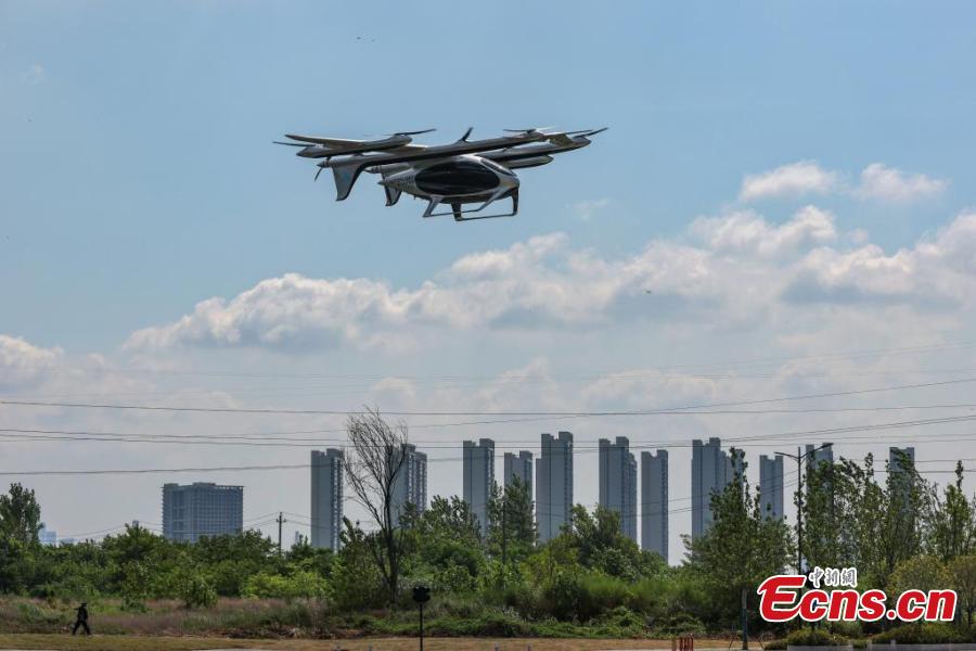 An electric vertical take-off and landing (eVTOL) aircraft makes a maiden flight over the Yangtze River in Nanjing, east China's Jiangsu Province, Aug. 1, 2024. (Photo: China News Service/Yang Bo)