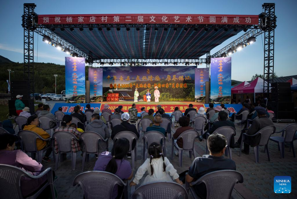 Tourists and villagers enjoy a performance at the Yangjiadian Village in Guyuan City, northwest China's Ningxia Hui Autonomous Region, Aug. 1, 2024. Relying on abundant red tourism resources of the Liupan Mountain, local authorities in Yangjiadian have actively developed homestay and rural tourism to advance rural revitalization. (Xinhua/Yang Zhisen)