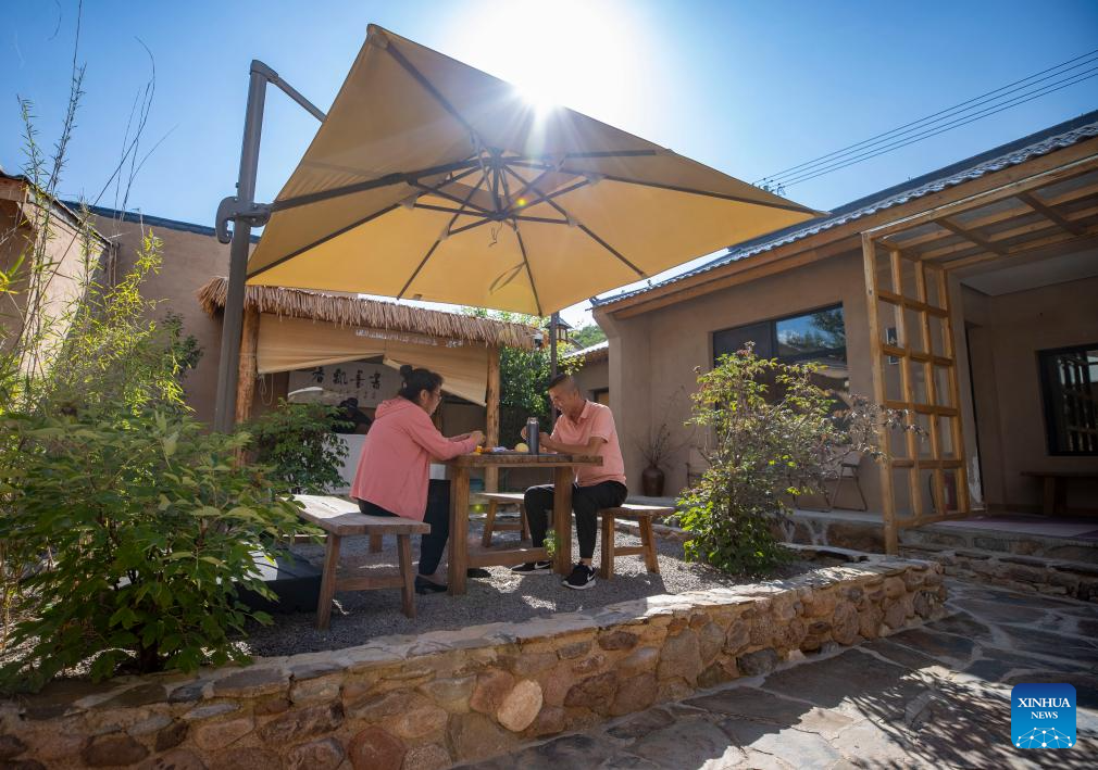 Tourists enjoy leisure time at a homestay of the Yangjiadian Village in Guyuan City, northwest China's Ningxia Hui Autonomous Region, Aug. 1, 2024. Relying on abundant red tourism resources of the Liupan Mountain, local authorities in Yangjiadian have actively developed homestay and rural tourism to advance rural revitalization. (Xinhua/Yang Zhisen)