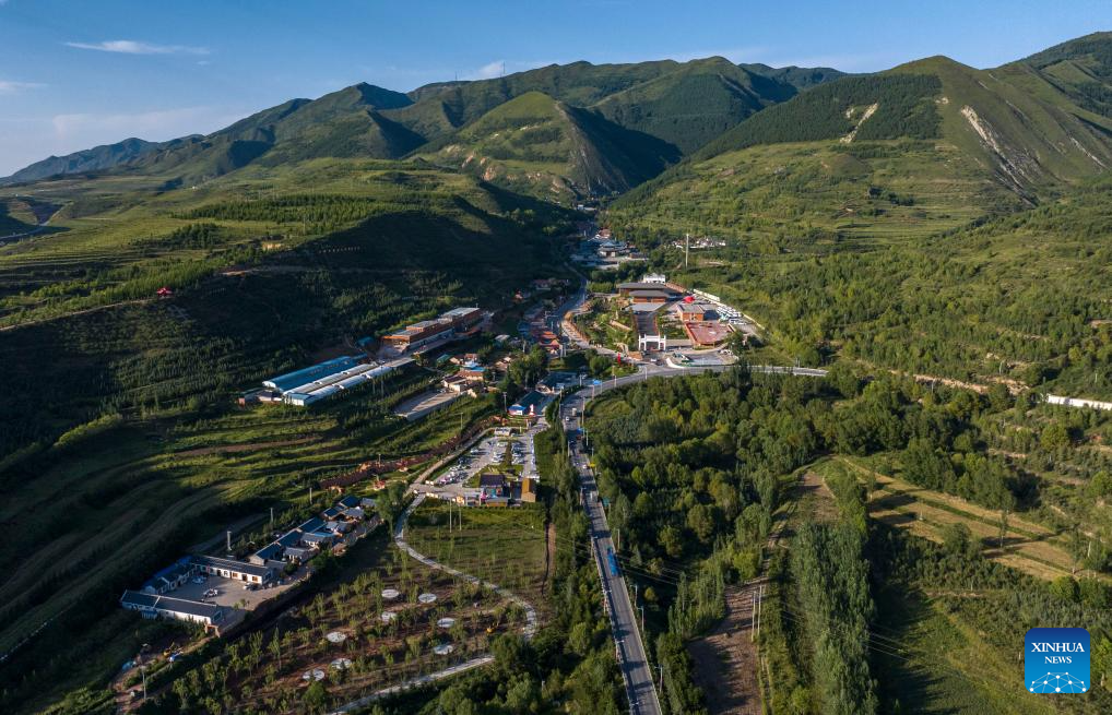 An aerial drone photo taken on Aug. 1, 2024 shows the Yangjiadian Village in Guyuan City, northwest China's Ningxia Hui Autonomous Region. Relying on abundant red tourism resources of the Liupan Mountain, local authorities in Yangjiadian have actively developed homestay and rural tourism to advance rural revitalization. (Xinhua/Yang Zhisen)
