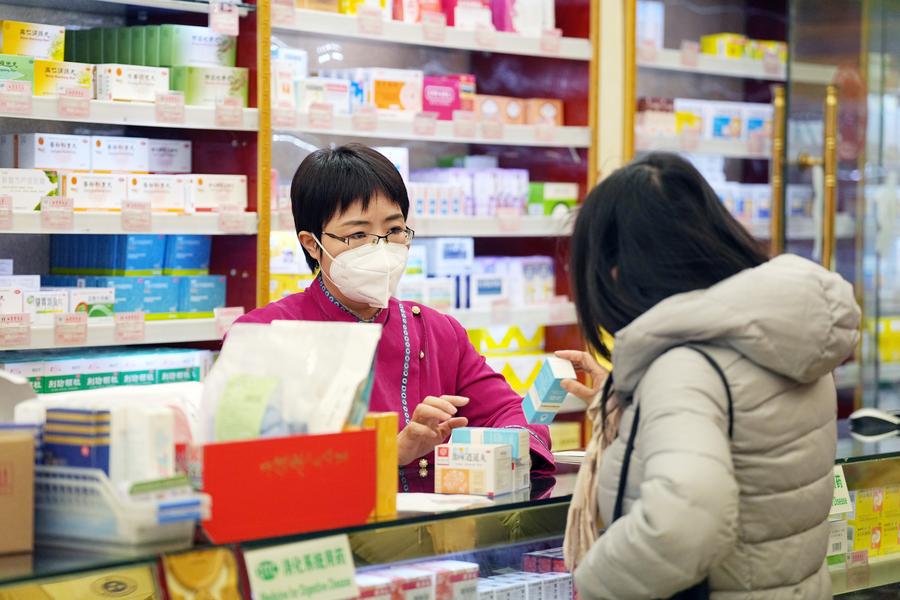 This photo taken on Feb. 22, 2023 shows pharmacist Zhang Haiou (L) helping a customer on medicine consultation and medication instruction at Baita Temple pharmacy in Beijing, capital of China. (Xinhua/Ju Huanzong)