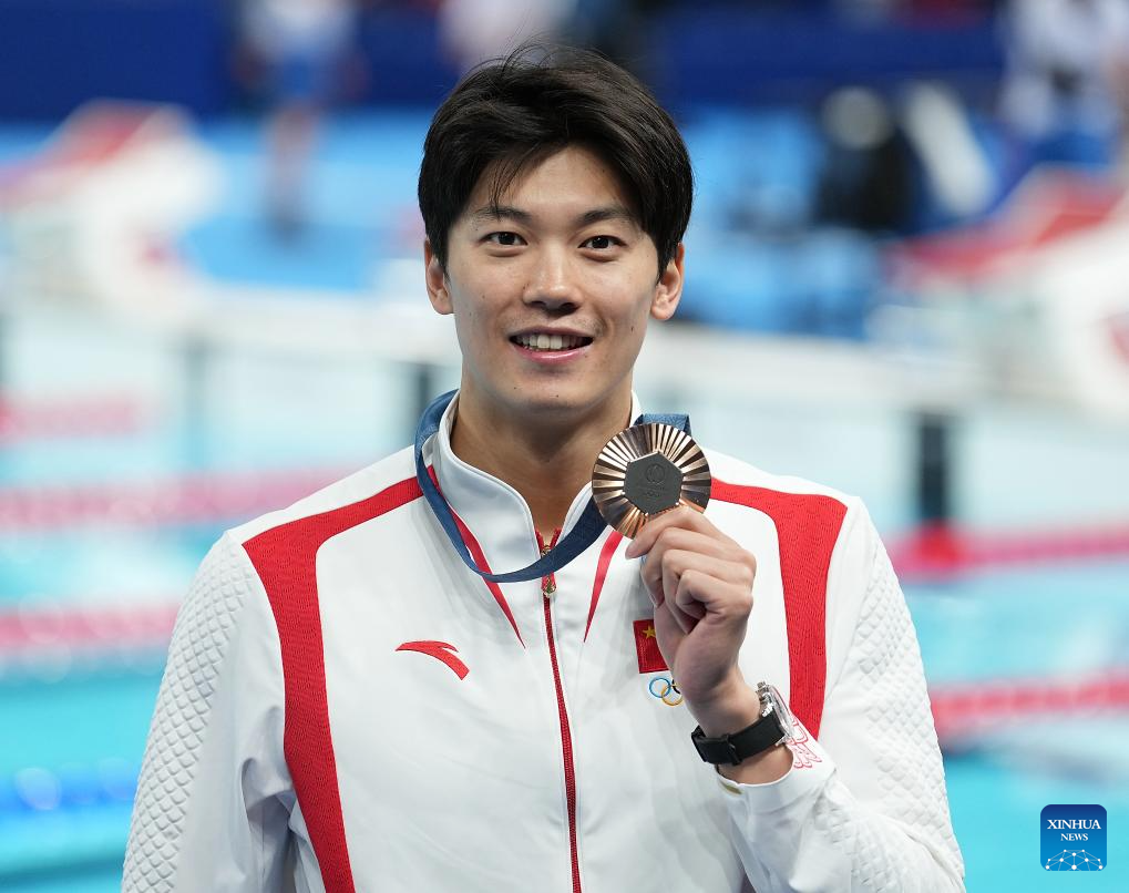 Bronze medalist Wang Shun of China poses during the victory ceremony for the men's 200m individual medley of swimming at Paris 2024 Olympic Games in Paris, France, on Aug. 2, 2024. (Xinhua/Xue Yuge)