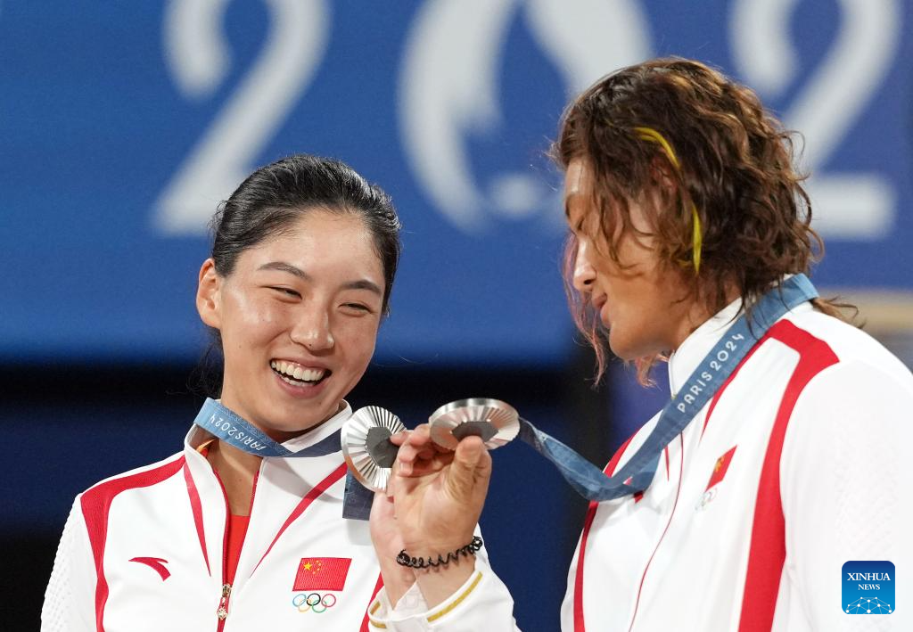 Silver medalists Wang Xinyu/Zhang Zhizhen of China attend the victory ceremony for the mix doubles of tennis at the Paris 2024 Olympic Games in Paris, France, on Aug. 2, 2024. (Xinhua/Wan Xiang)