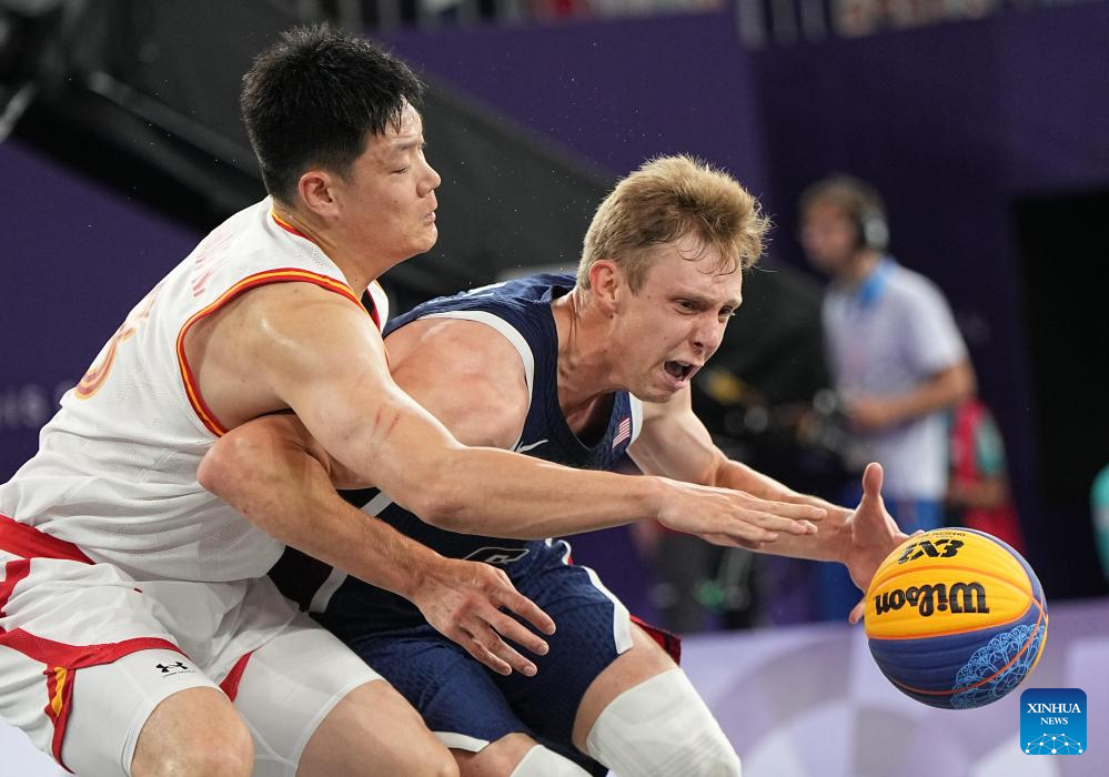 Canyon Barry (R) of the United States drives during the 3x3 basketball men's pool round game between China and the United States at the Paris 2024 Olympic Games in Paris, France, on Aug. 2, 2024. (Xinhua/Meng Yongmin)