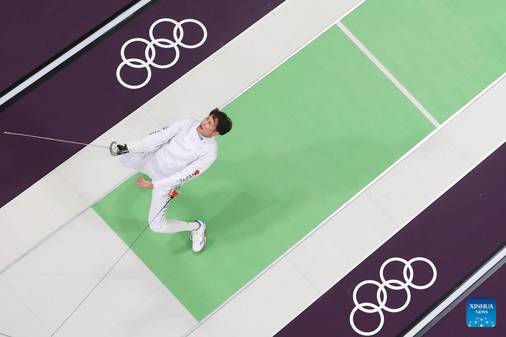 Yamada Masaru of Japan celebrates after the men's epee team semifinal of fencing between the Czech Republic and Japan at the Paris 2024 Olympic Games in Paris, France, Aug. 2, 2024. (Xinhua/Xu Zijian)