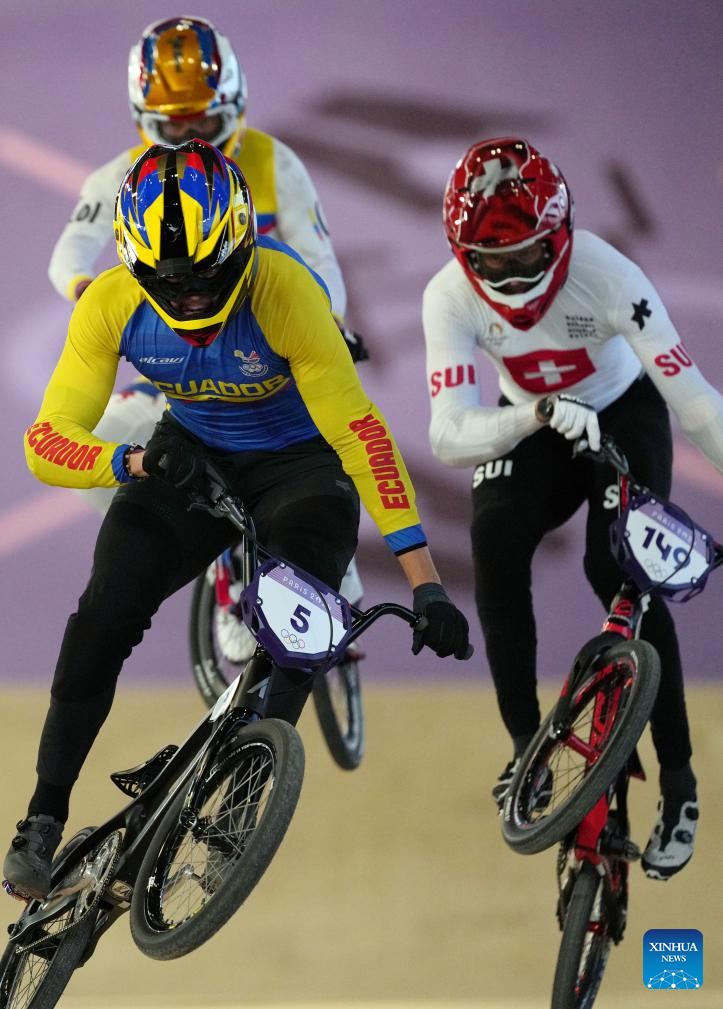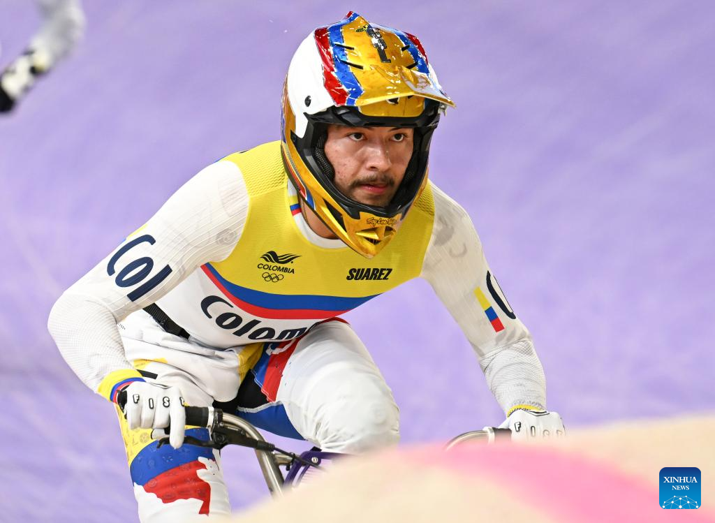 Mateo Carmona Garcia of Colombia competes during the men's semifinal of Cycling BMX Racing at the Paris 2024 Olympic Games in Paris, France, on Aug. 2, 2024. (Xinhua/Hu Huhu)