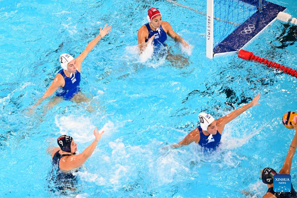Dafne Bettini of Italy (R, bottom) shoots during the women's preliminary round group B match of water polo between Greece and Italy at the Paris 2024 Olympic Games in Saint-Denis, France, Aug. 2, 2024. (Xinhua/Chen Yichen)