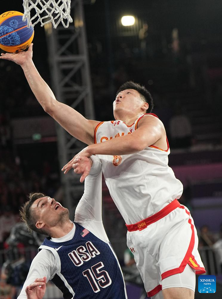 Zhang Ning (top) of China goes for a layup during the 3x3 basketball men's pool round game between China and the United States at the Paris 2024 Olympic Games in Paris, France, on Aug. 2, 2024. (Xinhua/Meng Yongmin)