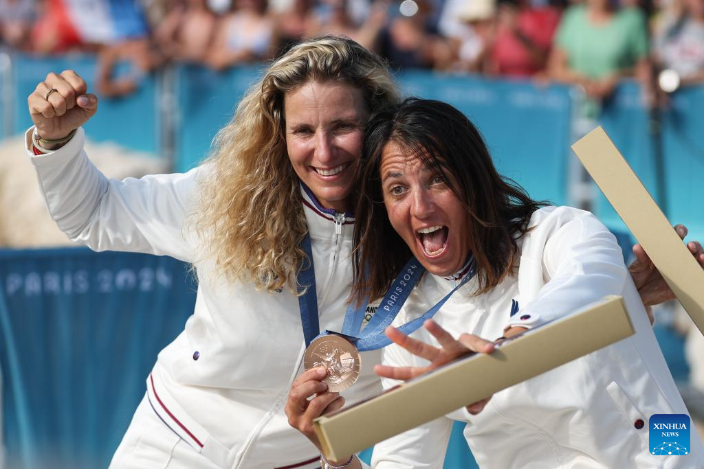 Bronze medalists Sarah Steyaert (L)/Charline Picon of France react during the victory ceremony for the sailing women's skiff (49erFX) at the Paris 2024 Olympic Games in Marseille, France, Aug. 2, 2024. (Xinhua/Zheng Huansong)