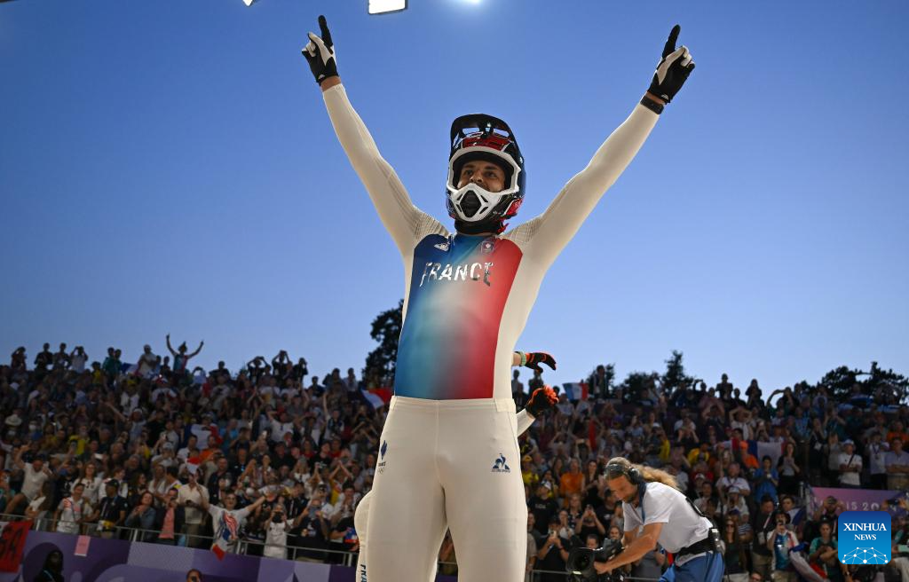 Joris Daudet of France celebrates after the men's final of Cycling BMX Racing at the Paris 2024 Olympic Games in Paris, France, on Aug. 2, 2024. (Xinhua/Hu Huhu)