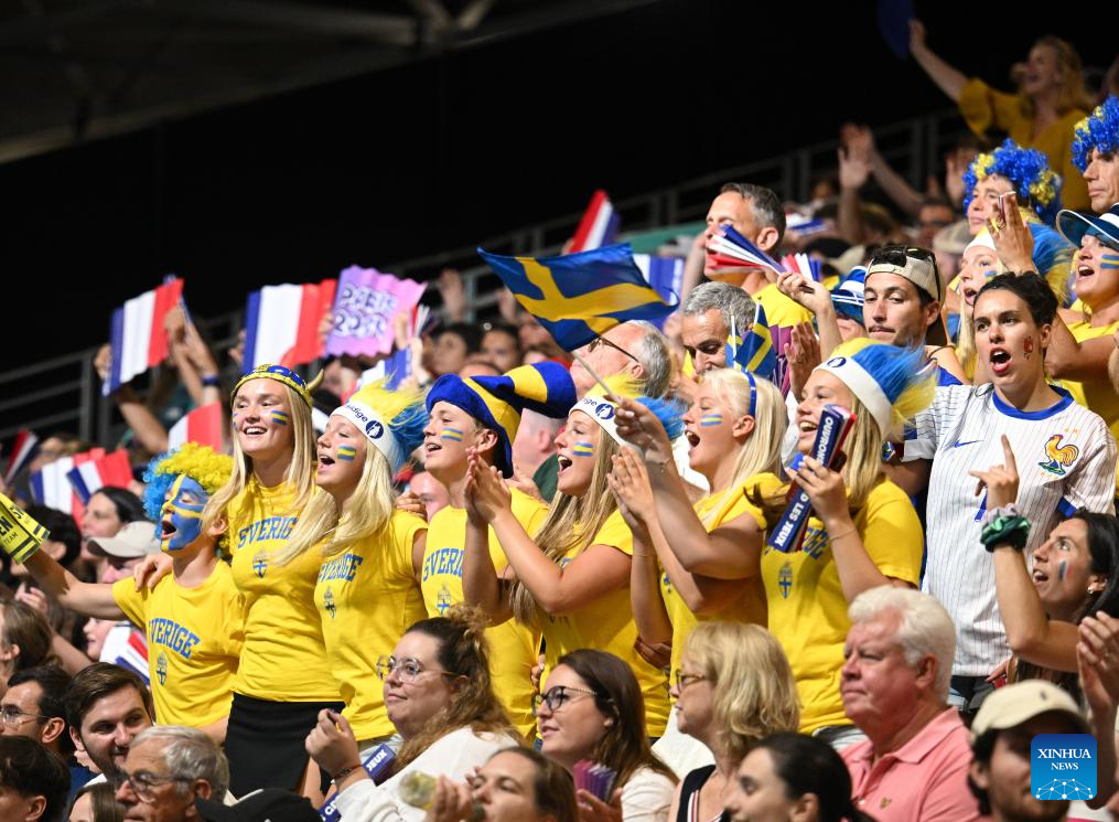 Spectators cheer during the men's handball preliminary round Group A match between Croatia and Sweden at the Paris 2024 Olympic Games in Paris, France, Aug. 2, 2024. (Xinhua/He Canling)
