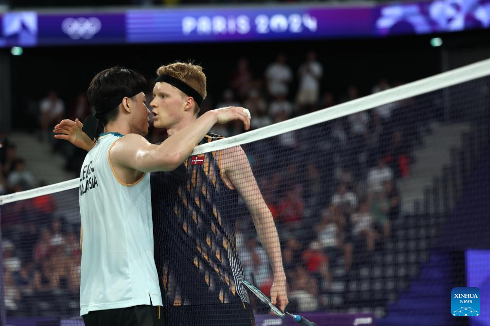 Lee Zii Jia (L) of Malaysia and Anders Antonsen of Denmark greet each other after the men's singles quarterfinal of badminton at the Paris 2024 Olympic Games in Paris, France, Aug. 2, 2024. (Xinhua/Chen Bin)