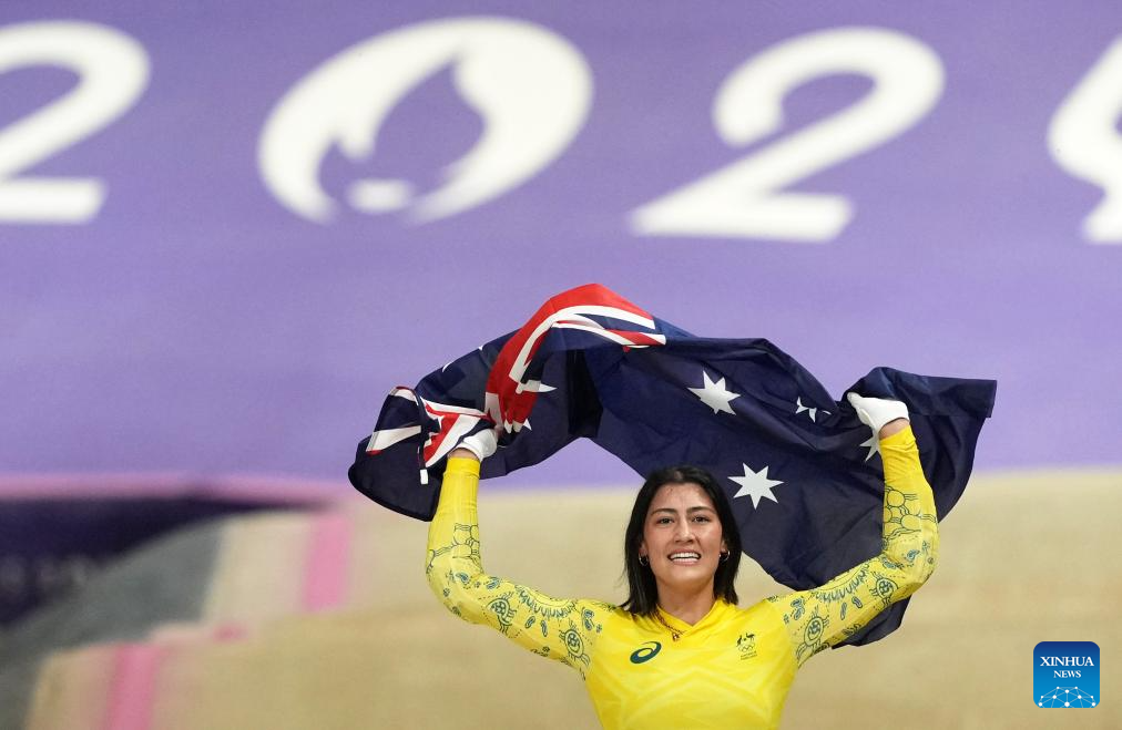 Saya Sakakibara of Australia celebrates after the women's final of Cycling BMX Racing at the Paris 2024 Olympic Games in Paris, France, on Aug. 2, 2024. (Xinhua/Li Yibo)