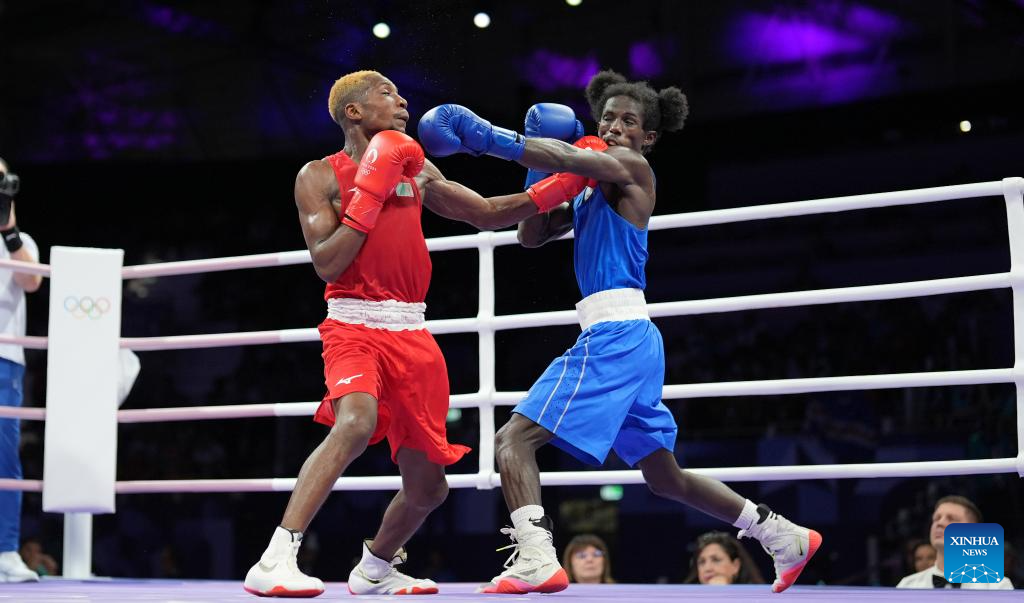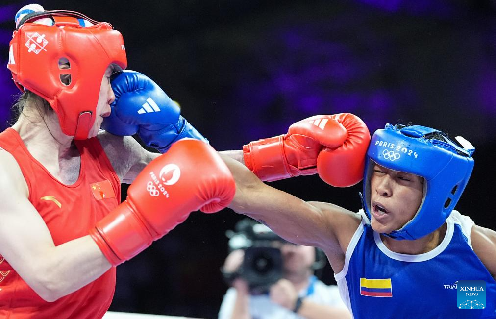 Xu Zichun (L) of China competes with Valeria Arboleda Mendoza of Colombia during the women's 57kg preliminaries round of 16 of boxing at the Paris 2024 Olympic Games in Paris, France, Aug. 2, 2024. (Xinhua/Jiang Wenyao)