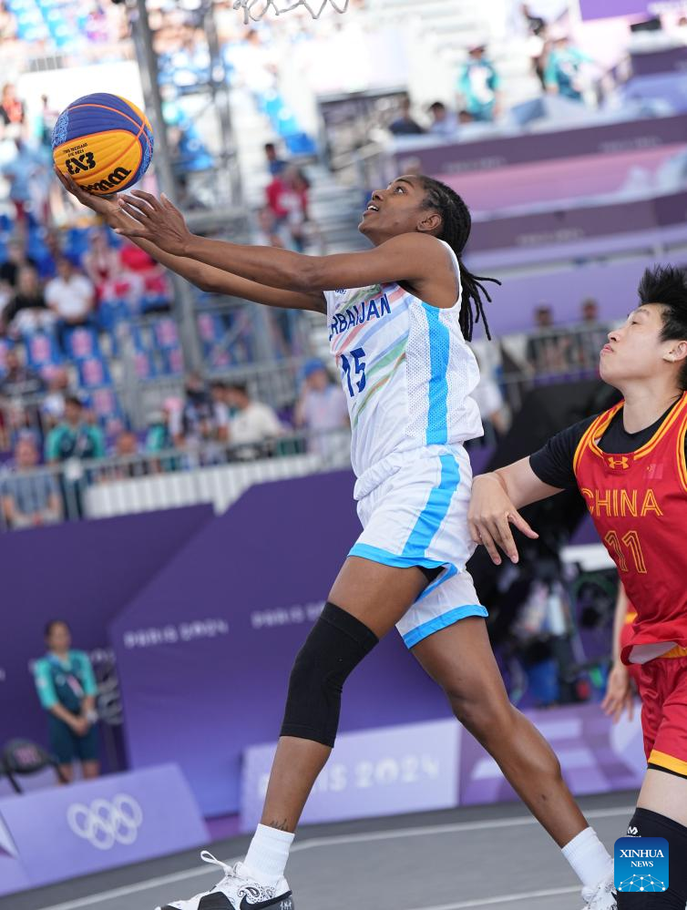 Tiffany Hayes (L) of Azerbaijan attempts a layup during the 3x3 basketball women's pool round game between China and Azerbaijan at the Paris 2024 Olympic Games in Paris, France, Aug. 2, 2024. (Xinhua/Meng Yongmin)