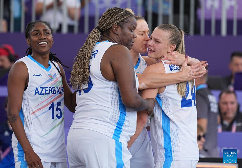 Players of Azerbaijan celebrate victory after the 3x3 basketball women's pool round game between China and Azerbaijan at the Paris 2024 Olympic Games in Paris, France, Aug. 2, 2024. (Xinhua/Meng Yongmin)