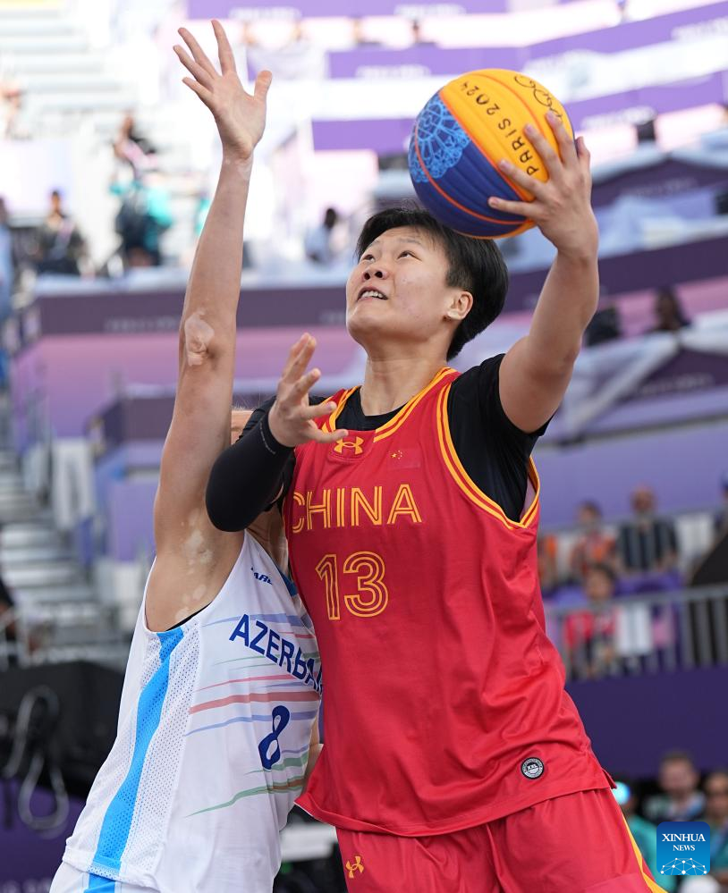 Zhang Zhiting (R) of China competes during the 3x3 basketball women's pool round game between China and Azerbaijan at the Paris 2024 Olympic Games in Paris, France, Aug. 2, 2024. (Xinhua/Meng Yongmin)
