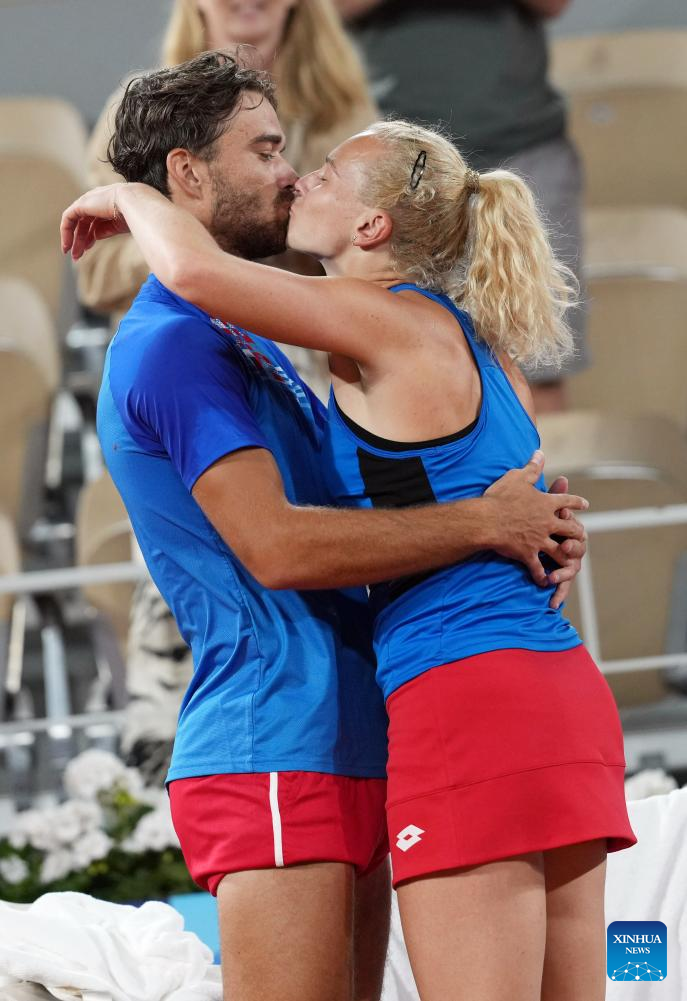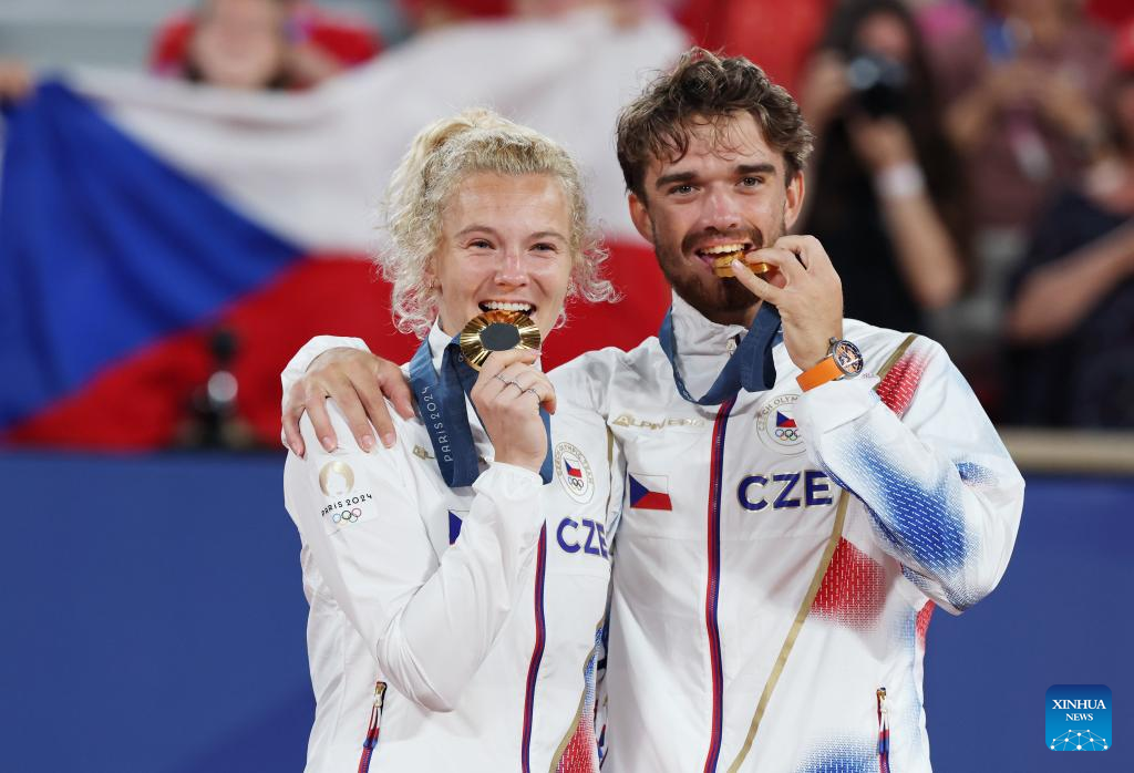 Katerina Siniakova (R)/Tomas Machac of Czech Republic celebrate after the mix doubles gold medal match of tennis between Wang Xinyu/Zhang Zhizhen of China and Katerina Siniakova/Tomas Machac of Czech Republic at the Paris 2024 Olympic Games in Paris, France, on Aug. 2, 2024. (Xinhua/Wan Xiang)