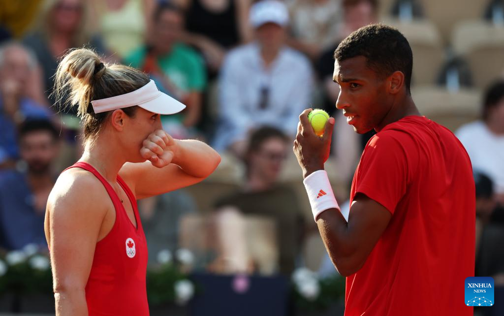Gabriela Dabrowski (L)/Felix Auger-Aliassime of Canada react during the mix doubles bronze medal match of tennis between Gabriela Dabrowski/Felix Auger-Aliassime of Canada and Demi Schuurs/Wesley Koolhof of the Netherlands at the Paris 2024 Olympic Games in Paris, France, on Aug. 2, 2024. (Xinhua/Gao Jing)