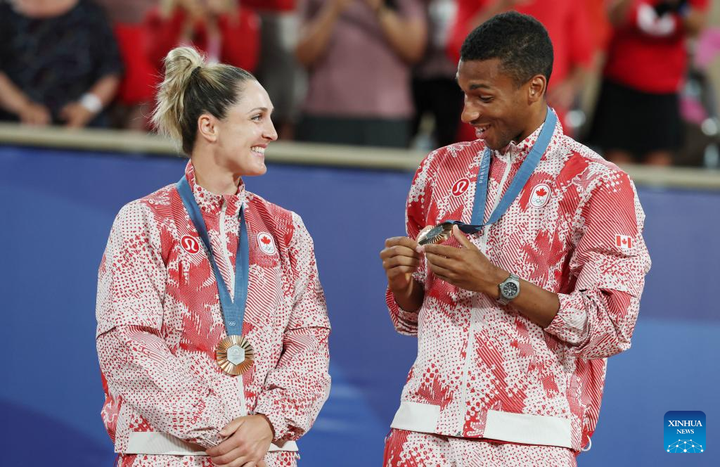Bronze medalists Gabriela Dabrowski/Felix Auger-Aliassime of Canada attend the victory ceremony for the mix doubles of tennis at the Paris 2024 Olympic Games in Paris, France, on Aug. 2, 2024. (Xinhua/Gao Jing)