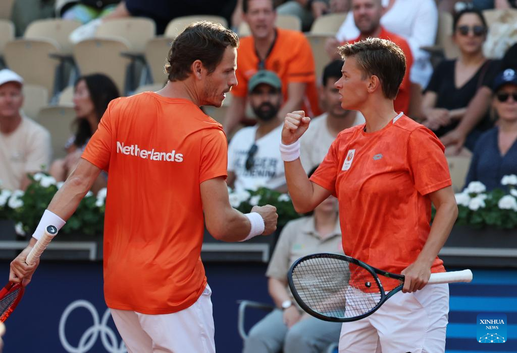 Demi Schuurs (R)/Wesley Koolhof of the Netherlands react during the mix doubles bronze medal match of tennis between Gabriela Dabrowski/Felix Auger-Aliassime of Canada and Demi Schuurs/Wesley Koolhof of the Netherlands at the Paris 2024 Olympic Games in Paris, France, on Aug. 2, 2024. (Xinhua/Gao Jing)