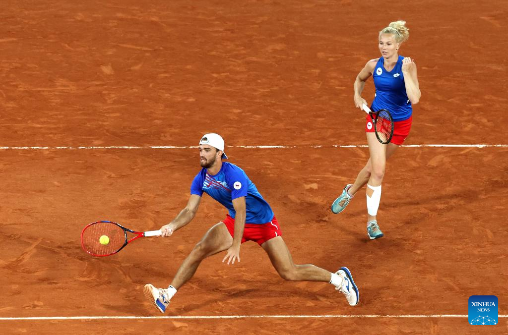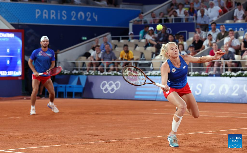 Katerina Siniakova (R)/Tomas Machac of Czech Republic compete during the mix doubles gold medal match of tennis between Wang Xinyu/Zhang Zhizhen of China and Katerina Siniakova/Tomas Machac of Czech Republic at the Paris 2024 Olympic Games in Paris, France, on Aug. 2, 2024. (Xinhua/Gao Jing)
