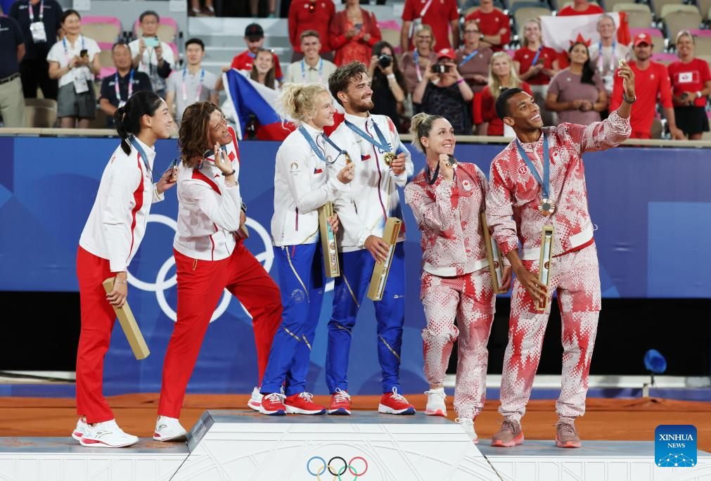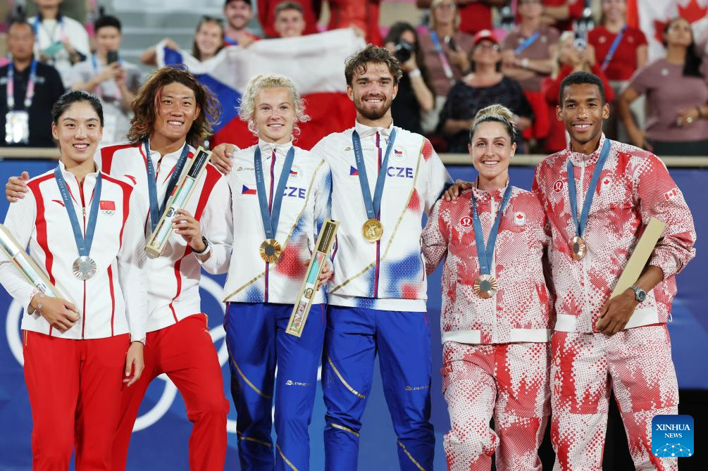 Gold medalists Katerina Siniakova/Tomas Machac (C) of Czech Republic, silver medalists Wang Xinyu/Zhang Zhizhen (L) of China and bronze medalists Gabriela Dabrowski/Felix Auger-Aliassime of Canada pose during the victory ceremony for the mix doubles of tennis at the Paris 2024 Olympic Games in Paris, France, on Aug. 2, 2024. (Xinhua/Gao Jing)