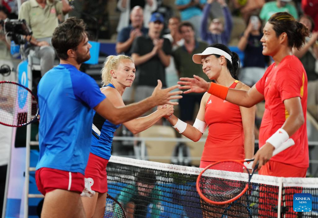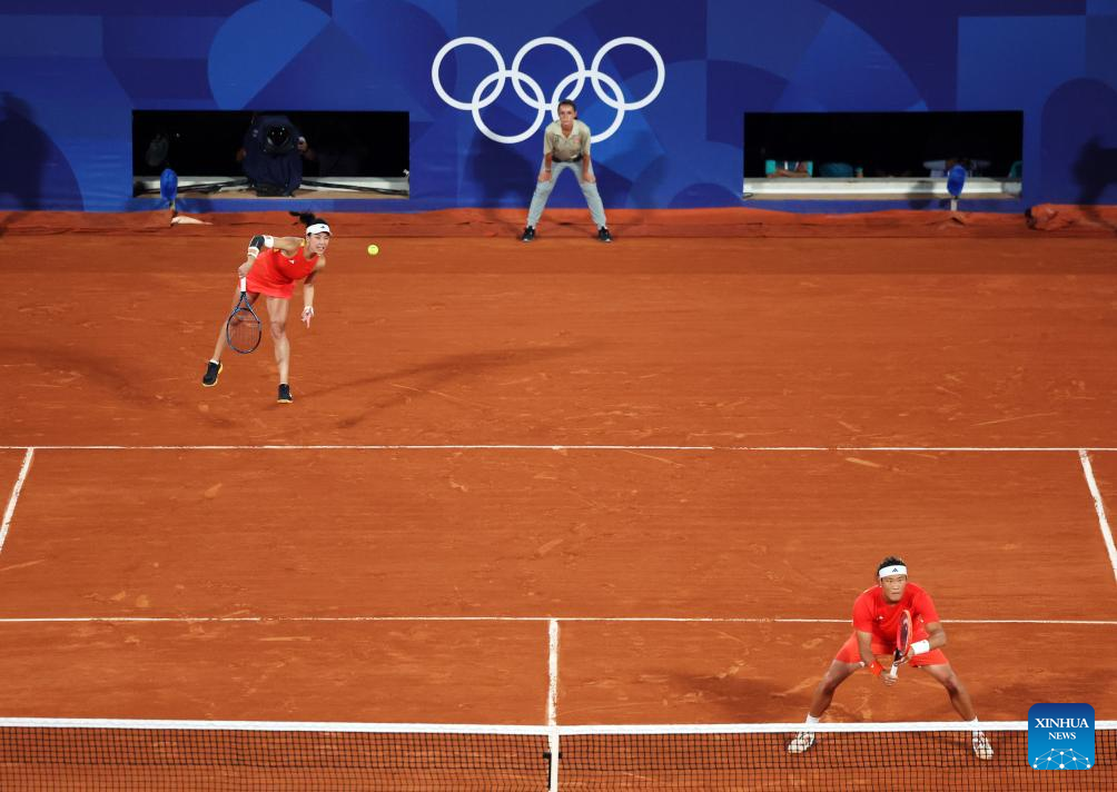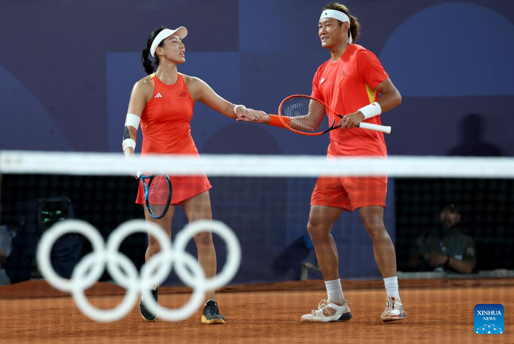 PARIS, Aug. 2 (Xinhua) -- In the first gold medal tennis match at Paris 2024, the Chinese mixed doubles pair of Wang Xinyu and Zhang Zhizhen lost a nailbiter 6-2, 5-7, 10-8 to the Czech Republic's Tomas Machac and nine-time Grand Slam doubles winner and Tokyo women's doubles gold medalist Katerina Siniakova.